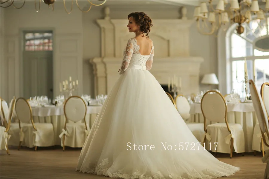 Свадебное платье принцессы, с длинными рукавами, кружевом и тюлем, с бисером, бальное платье с поясом, размера плюс, индивидуальное свадебное платье