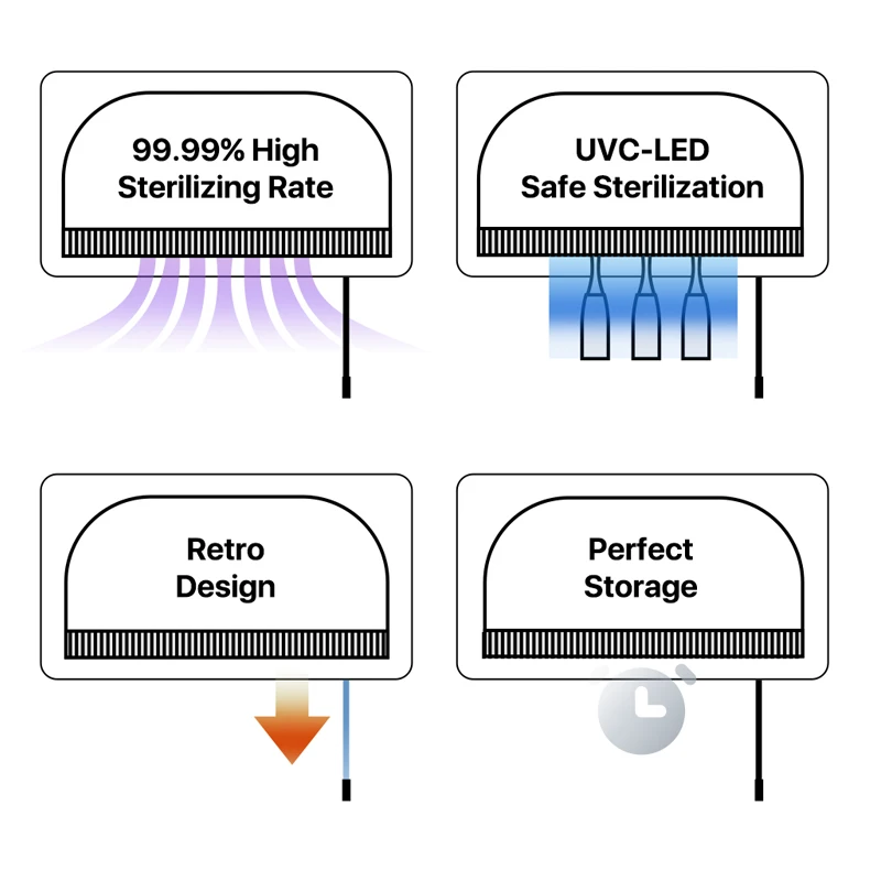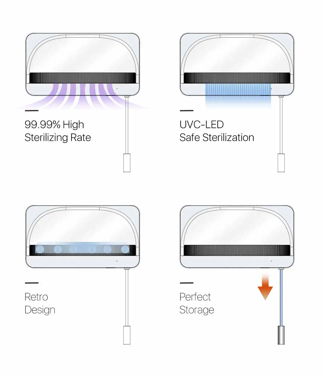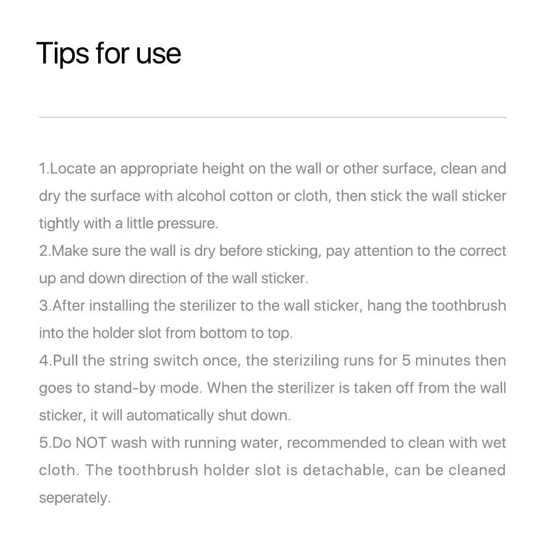 Основные характеристики:1. UVC-LED безопасная стерилизация, скорость стерилизации до 99.99%.2. Может удерживать до 5 зубных щеток для семьи, из которых 3 положения используются для дезинфекции и 2 положения используются для хранения. (Включая зубную щетку Phillips, oral-B и другую ручную зубную щетку.).3. Дизайн вдохновлен Ретро лампой с изогнутой формой и веревкой для вытягивания, которая может быть легко интегрирована в современную среду жизни.4. Дружелюбный синий световой светильник напоминает вам, чтобы избежать ультрафиолетового излучения.5. Основные зубные щетки, электрические зубные щетки и бритвы на рынке.6. Встроенный 1000 мА/ч, литий-ионный аккумулятор, зарядка для 2,5 h, используйте в течение 20 дней.Простая Работа:Продолжительность работы A: 5 минут (потянув струнный переключатель вручную).Продолжительность работы B: 2 минуты каждые 6 часов (автостерилизатор).Примечание:Время дезинфекции: шнурок стерилизуется в течение 5 минут, а затем автоматически стерилизуется в течение 2 минут каждые 6 часов, и пользователь будет повторно записывать время в следующий раз для шнурка.Напоминание о зарядке: белый дыхательный светильник напоминает вам о том, что он заряжается, зеленый светильник всегда включен, он полный, и красный светильник мигает, это напоминает вам зарядку.
