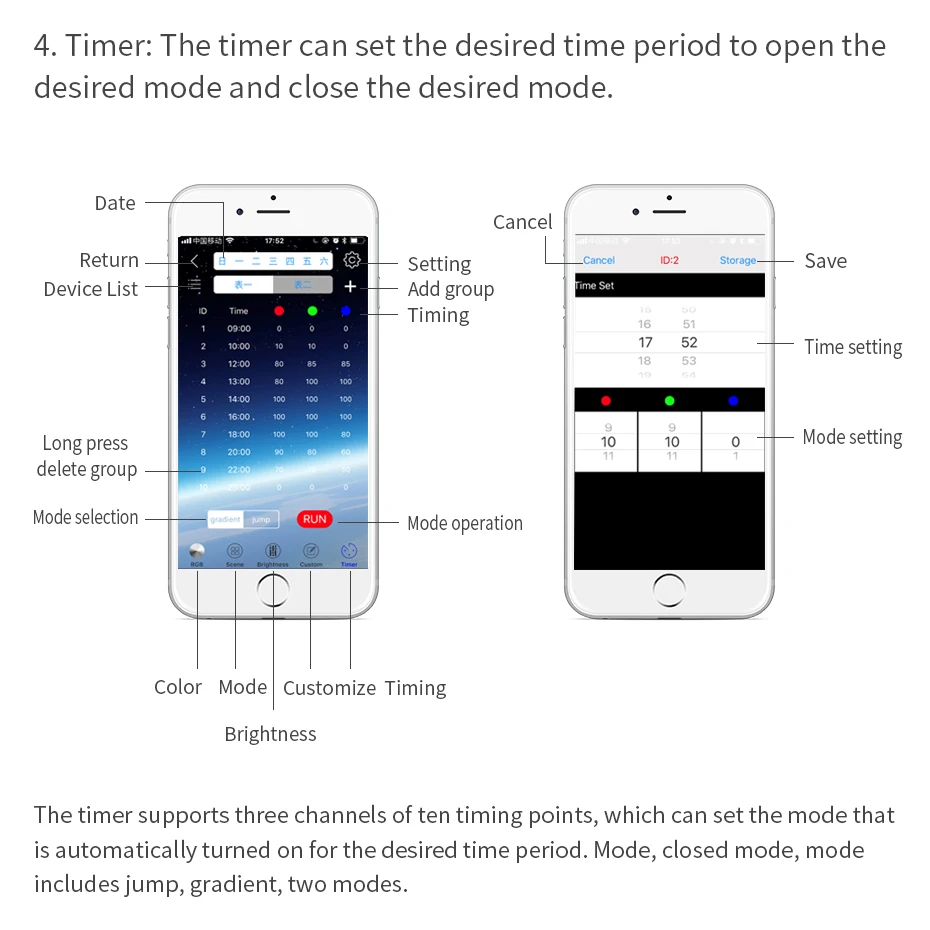 5. Таймер: таймер может установить желаемый период времени, чтобы открыть желаемый режим и закрыть желаемый режим. Таймер поддерживает три канала, десять точек синхронизации, которые можно настроить для автоматического включения желаемого периода времени и режима выключения. Режим включает в себя прыжок, градиент и два режима. Количество таймера-10, вы можете добавить до 20, и вы можете удалить его. Подробности см. На фото ниже. Справа в верхней части есть «+», нажмите «+», чтобы добавить таймер, нажмите и удерживайте таймер, чтобы удалить его.
