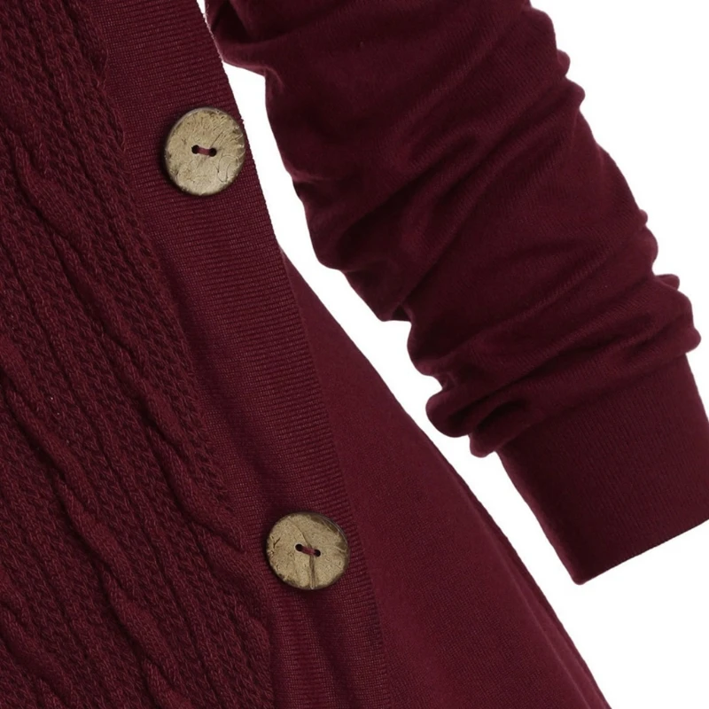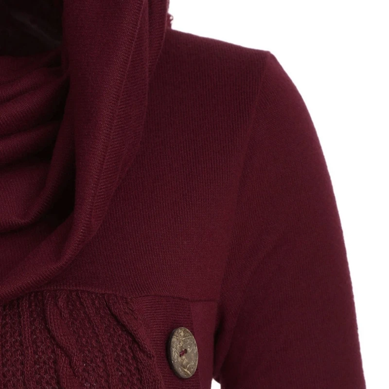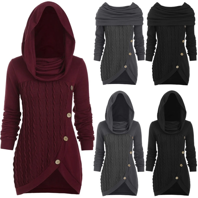 Женская куртка с капюшоном платье-свитер с воротником хомут, декорированные кнопками, с асимметричным подолом пуловер Туника однотонный топ с длинными рукавами, Цвет вязаный рубашка джемпер