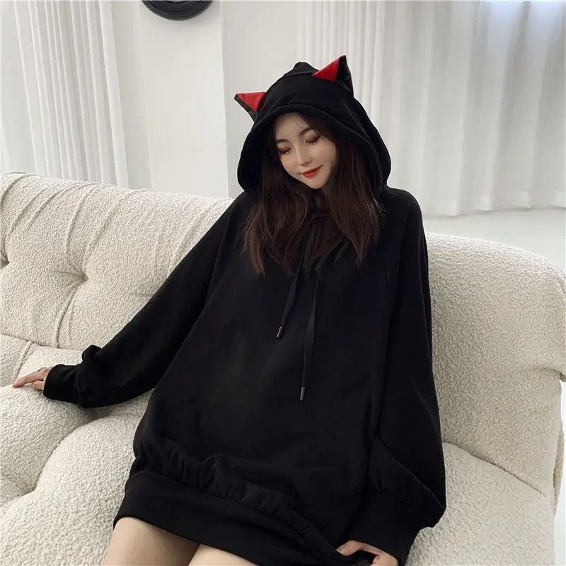 Худи HOUZHOU с кошачьими ушками женская черная Милая осенне-зимняя ...