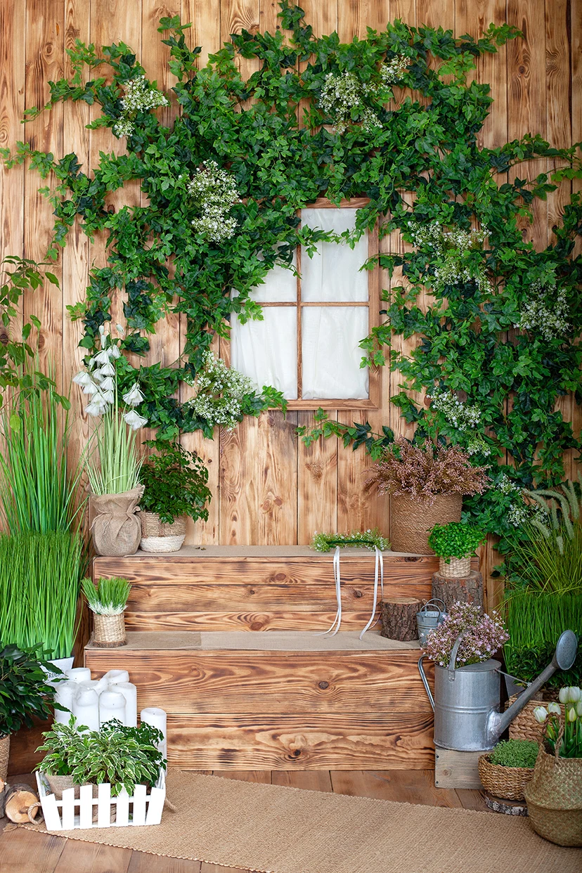 Фон для фотосъемки новорожденных с изображением весенней деревянной стены и цветов