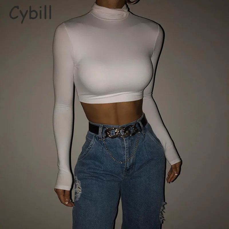 Сибилл свободного покроя с высоким, плотно облегающим шею воротником Топ для женщин 2020 осень длинный рукав укороченный топ 2020, женская обувь черного и коричневого цвета, футболка с короткими рукавами, одежда для девушек
