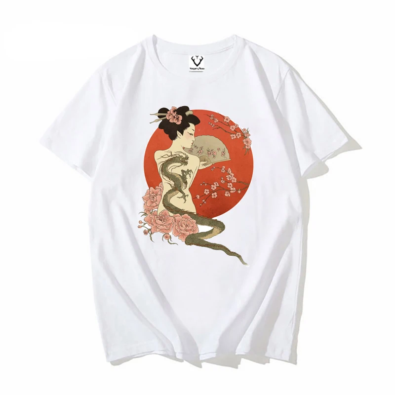 Футболка geisha в японском стиле укиё Мужская, Повседневная рубашка с коротким рукавом, с надписью Сказка дракона, белая винтажная уличная одежда в стиле унисекс