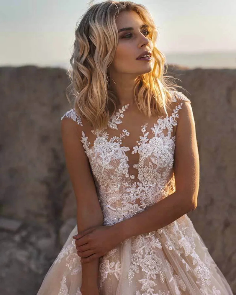 Женские роскошные аппликация из кружева, вышитая бисером Иллюзия Бальные фон винтажного пола Длина свадебное платье Vestido De Noiva Brautkleid