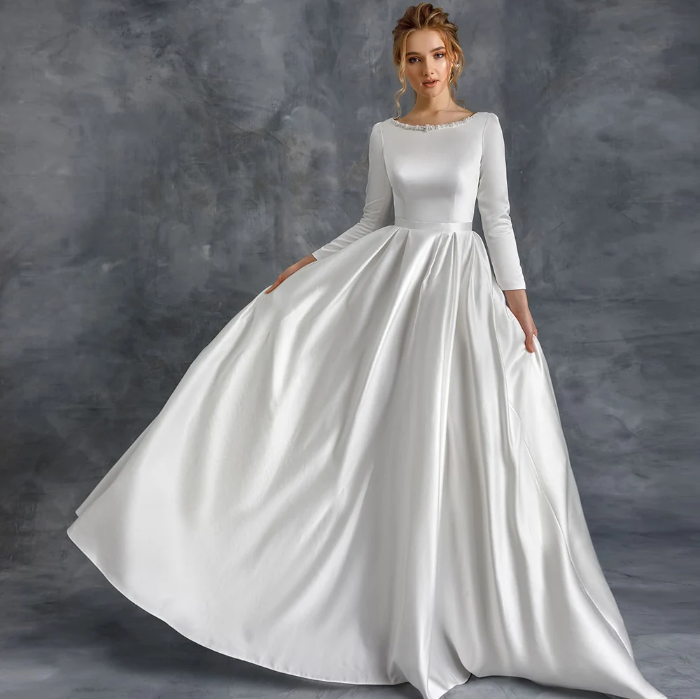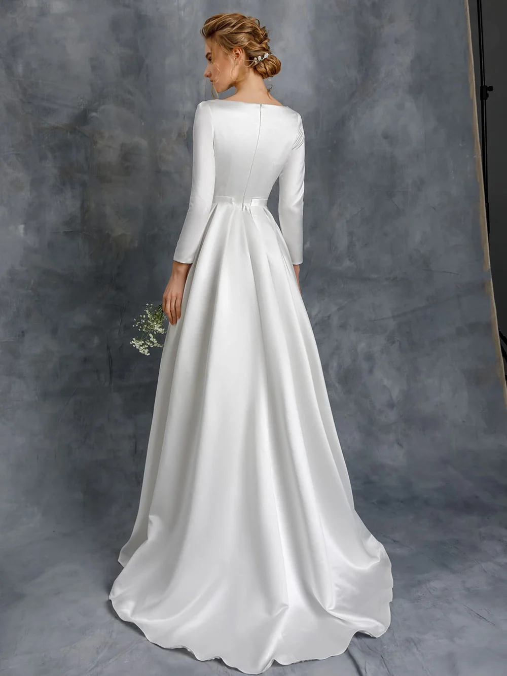 Классические простые свадебные платья трапециевидной формы, драпировка бисер с длинным рукавом, длина Foor 2020, Новое поступление, женские свадебные платья