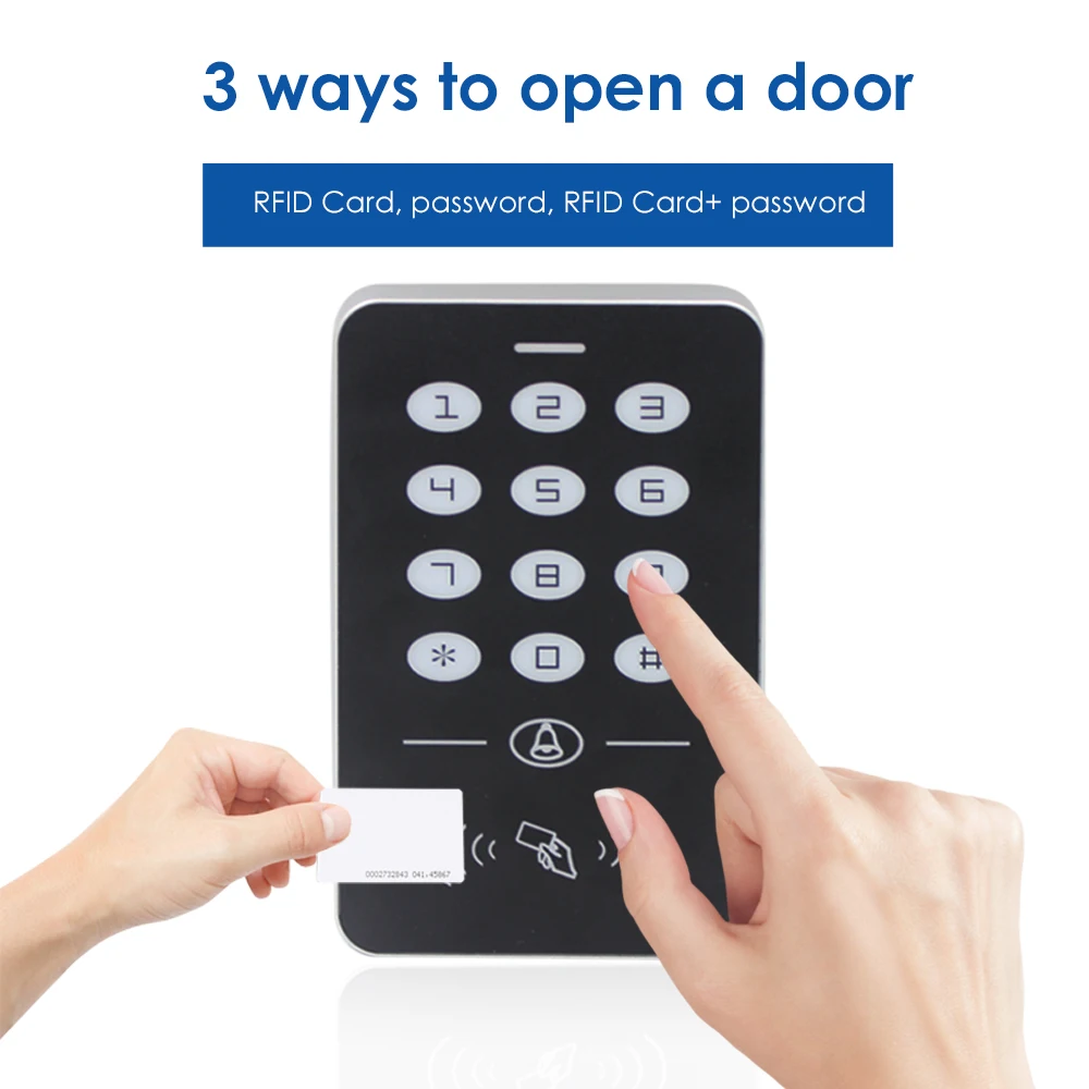 Есть три способа открыть дверь с помощью RFID карты, пароль,