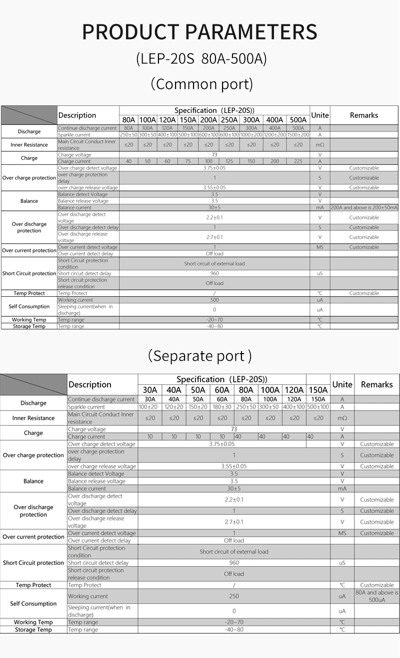 ◆Типичное Обнаружение напряжения для каждой ячейки. Таким образом, каждый аккумулятор будет предотвращен из-за заряда или разрядки. Защита от перегрузки по току и короткого замыкания