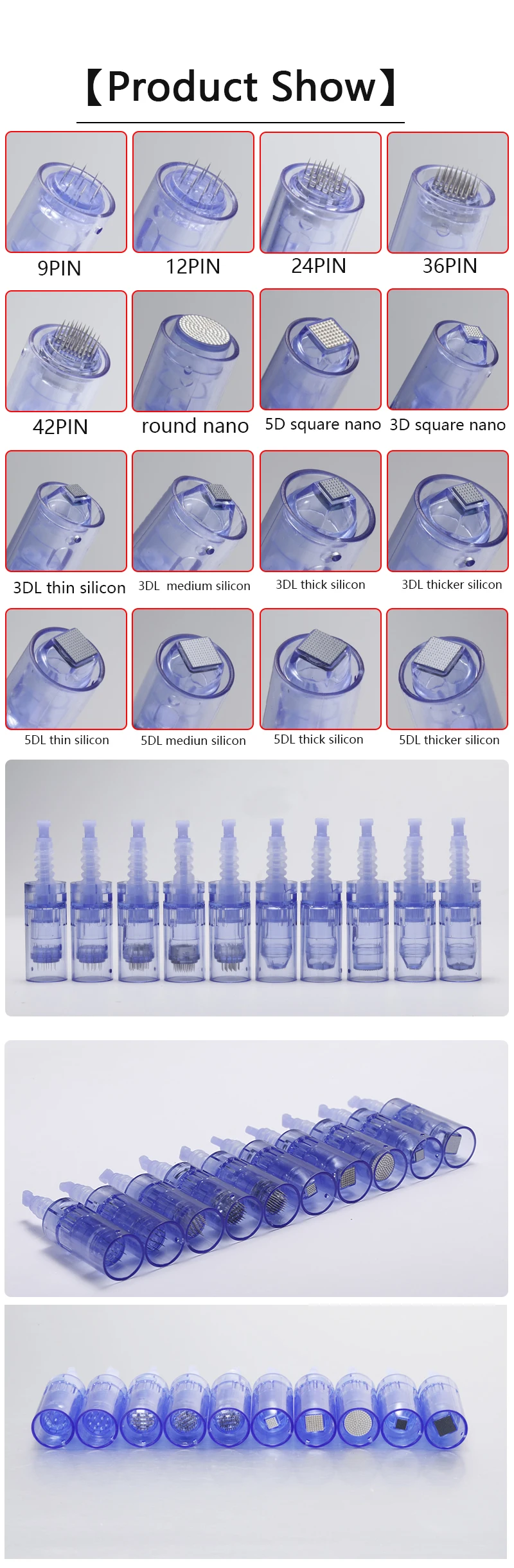 -Морщины (различные морщины, такие как: узор на голову, гусиные лапки, узор, различные морщины)-Очень хорошие шрамы от акне (вогнутые шрамы, вызванные различными причинами, шрамы после ожогов, ножевые раны, раны, ямы от акне, небольшие шрамы после царапин)-Растяжки, выпадение волос, ожирение-Отбеливание различных пигментных пятен-Увлажнение, укрепление кожи, пор-Удаление эритроцитов для восстановления чувствительной кожи, увеличение толщины кожиРуководства по выбору (только для рекомендации):-- 9 контактов: Восстанавливает моль, удаляет акне, устраняет растяжки, морщины.-- 12 контактов: Восстанавливает яму от оспы, удаляет акне, устраняет растяжки, морщины.-- 36 контактов: отбеливание, полив, удаление пятен, омоложение кожи, сужение пор.-- 42 контакта: удаление пятен; Восстановление ямы от оспы, омоложение кожи, сужение пор.-- Круглый нано: питает кожу без боли, отбеливает, увлажняет, удаляет пятна, ослабляет кожу, сужает поры и т. д.-- Square Nano: используется с продуктами по уходу за кожей, позволяя активному ингредиенту проникать в вашу кожу, не повреждая эпидермис для отбеливания, увлажнения, удаления пятен, ослабления кожи, сужения пор и т. д.-Силикон: подходит для ухода за зоной вокруг глаз, красным плато, полосками красной крови, тонкой кутикулой, чувствительной кожей и т. д.