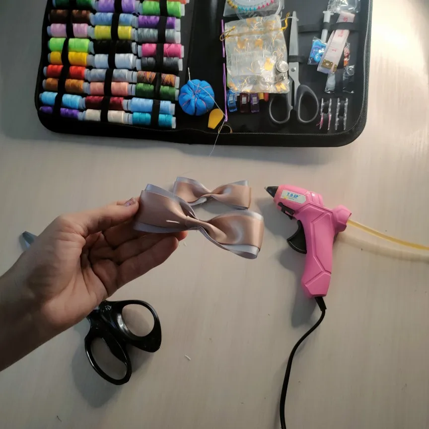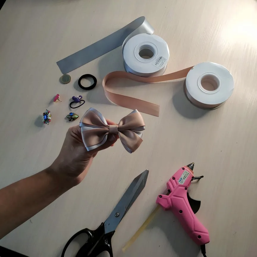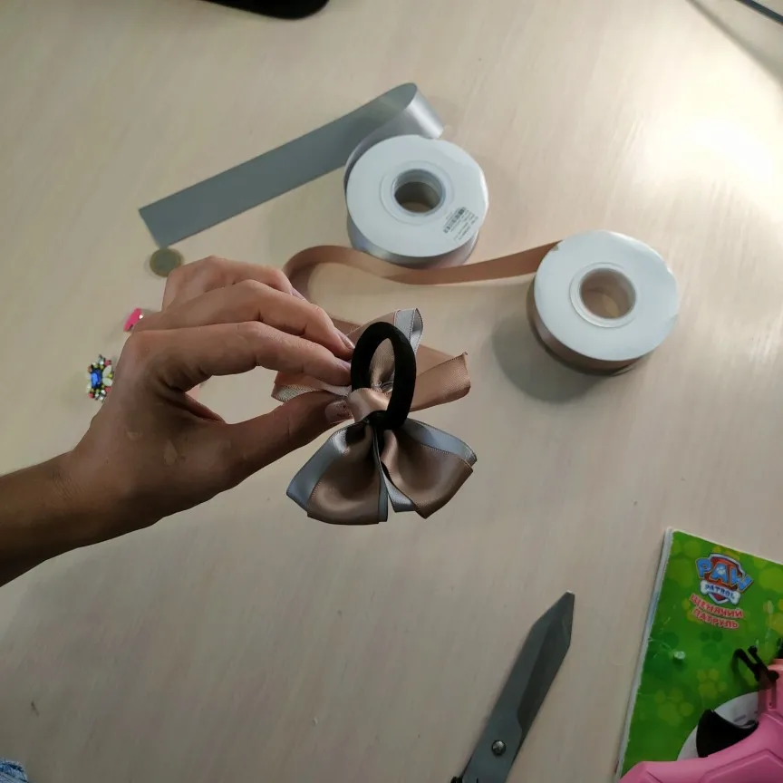 Ленты прелесть! Золотистая и серебристая, оба варианта словно состаренные. Сразу захотелось из них что-нибудь красивое сделать. Выбрала брошку, резинку, достала клеевой пистолет, нитку, иголку. Все легко, управилась за пол часа. Бантик для моей школьницы готов Дочка рада