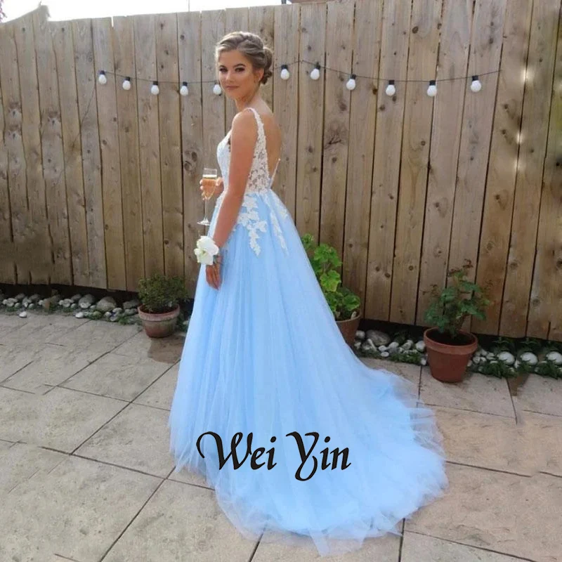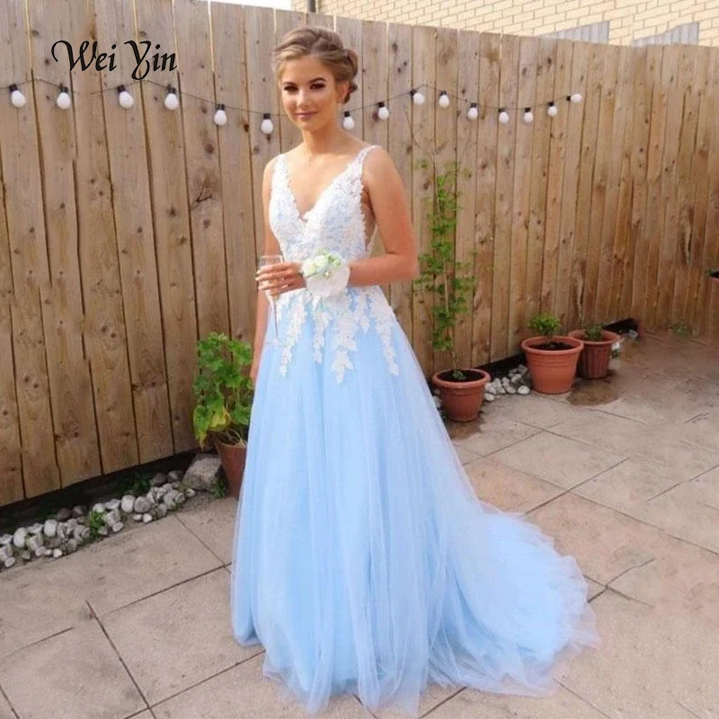 Платье для выпускного Weiyin AE0563 небесно-голубое ТРАПЕЦИЕВИДНОЕ с V-образным вырезом без рукавов Кружевное с аппликацией тюлевые драпированные Длинные вечерние платья платье