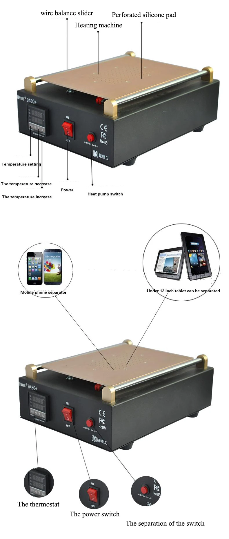 1. Просто поставьте ЖК на нагревательную панель, включите переключатель "вакуумный насос", затем вы сможете отделить стекло. И ЖК-дисплей прочно фиксируется на панели во время разделения.