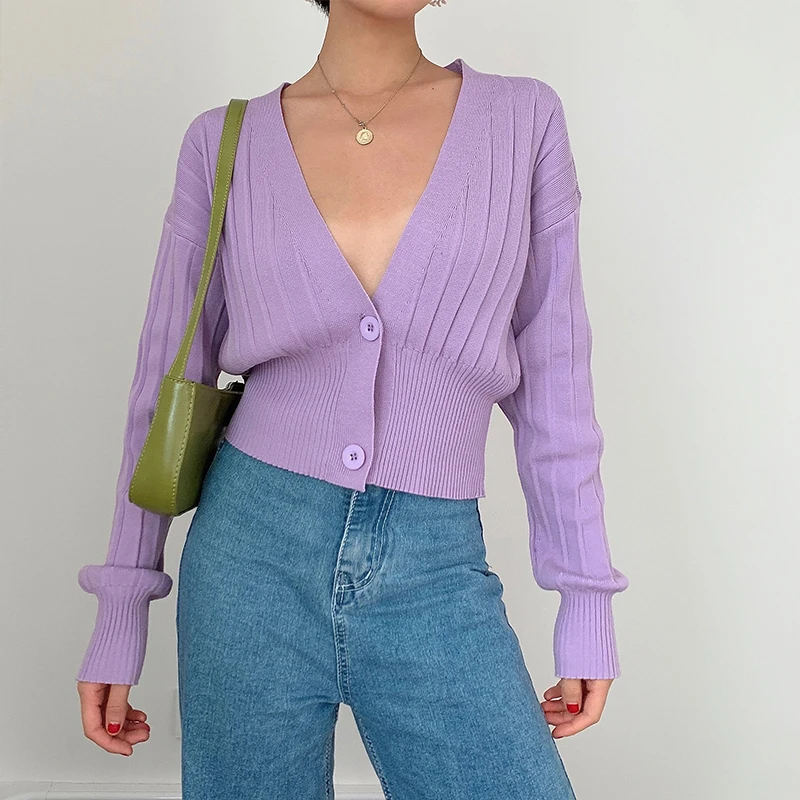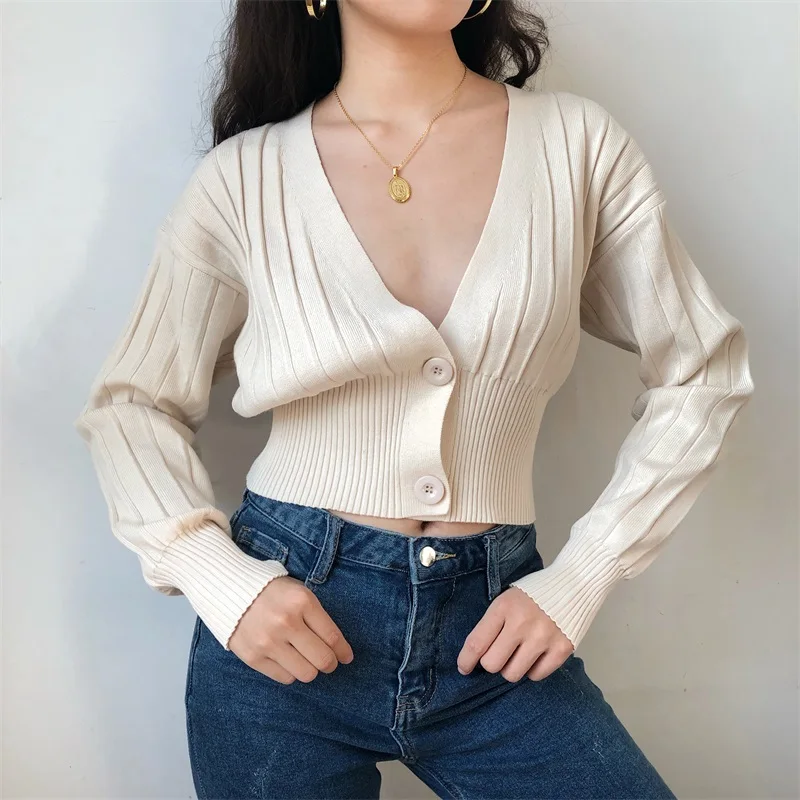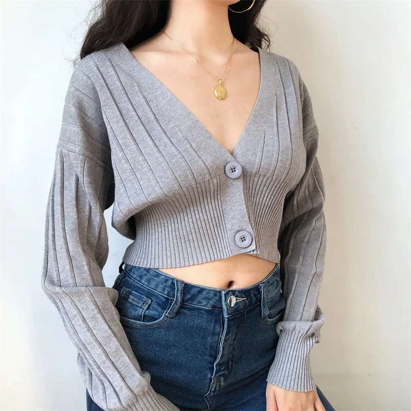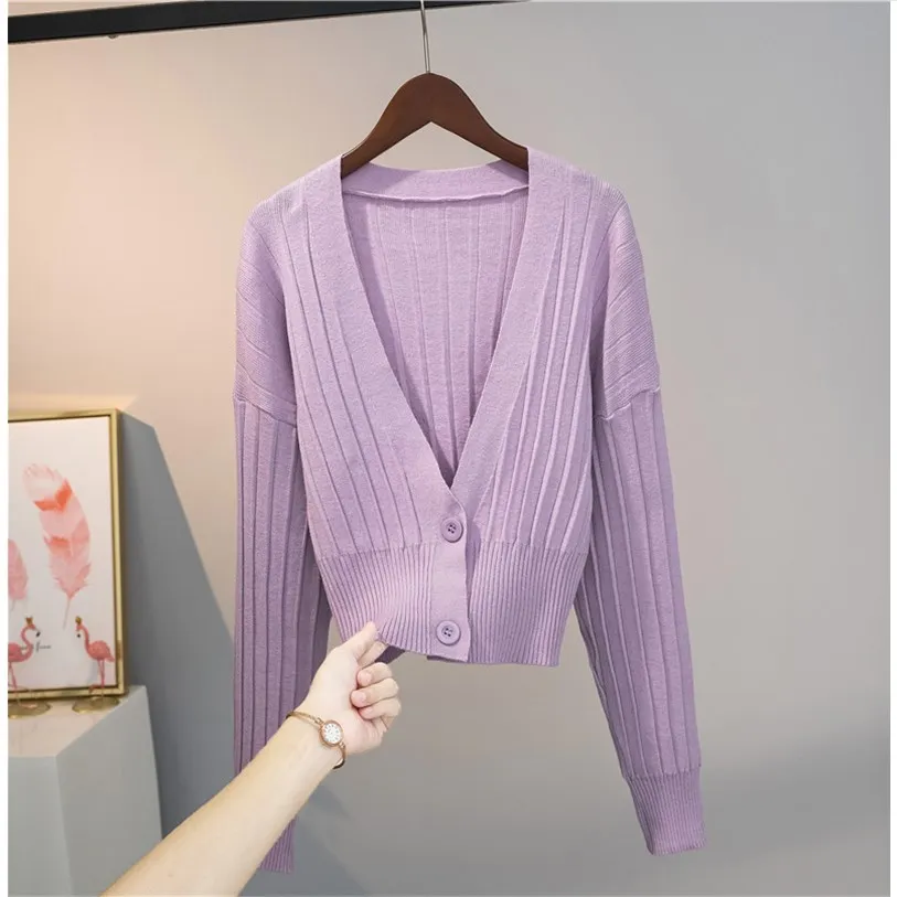 Женский трикотажный кардиган с V-образным вырезом, однотонный свободный винтажный короткий свитер в корейском ретро-стиле, весна-осень