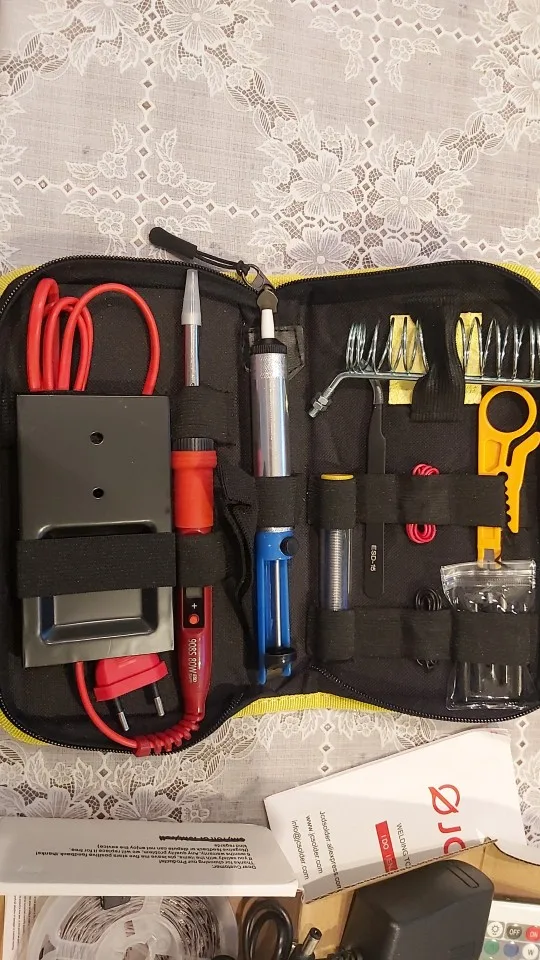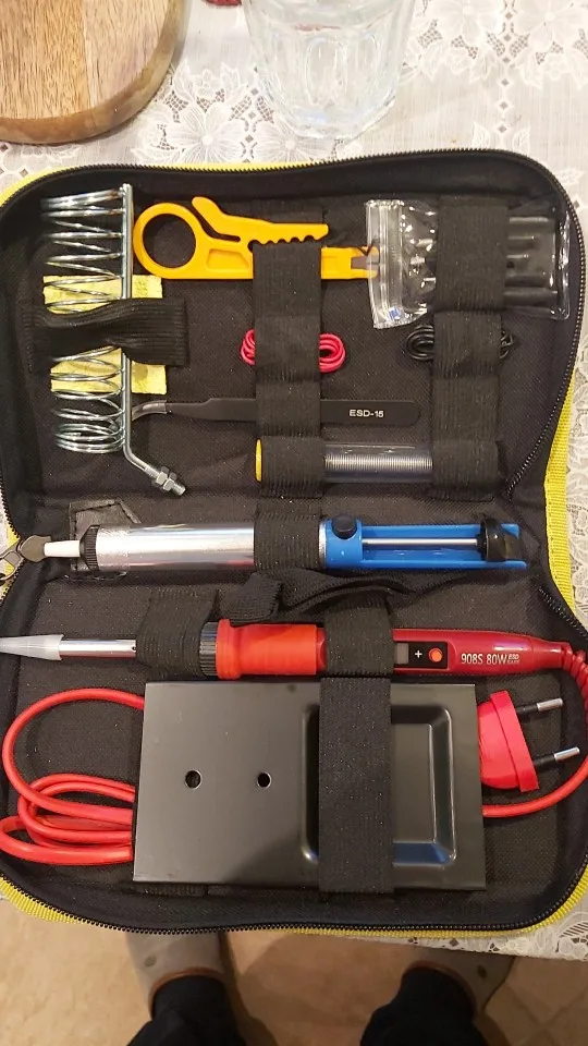 Оформил доставку из РФ. Заказ пришёл через 5 дней. Купил набор с сумкой. В итоге штуковина для зачистки проводов без всяких лезвий. Более-менее нормальные оловоотсос и пинцет (для непродолжительной работы нормуль). Комплектные "чёрные" жала хоть и лужёные, но через несколько минут не держат припой. В итоге взял старый комплект жал без всякого покрытия от паяльника с той самой крутилкой - прям нормуль стало. У паяльника заменил провод, так как комплектный показался мне жёстким. Сделал корректировку температуры паяльника минус 5 градусов Цельсия. Держатель паяльника очень лёгкий и норовит упасть. А так-то хороший набор для не глобальных решений.