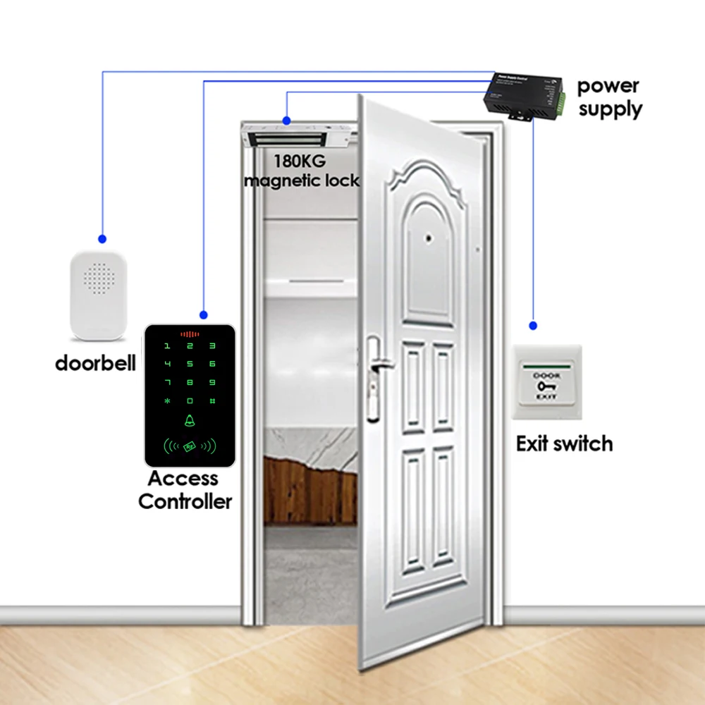 ПосылкаВ том числе: Клавиатура контроля доступа + блок питания + магнитный замок 180 кг + кронштейн U + дверной звонок + кнопка выхода + 10 брелоков