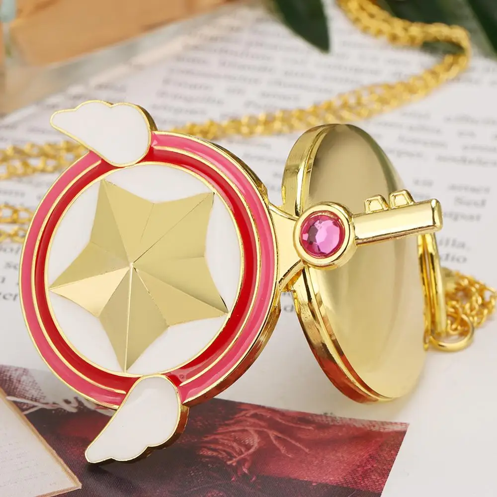 Маленькая обувь для косплея; Аниме Cardcaptor Sakura крыло со звездой ключ формы кварцевые карманные часы тонкий свитер цепи Для женщин Волшебные часы подарок для девочек