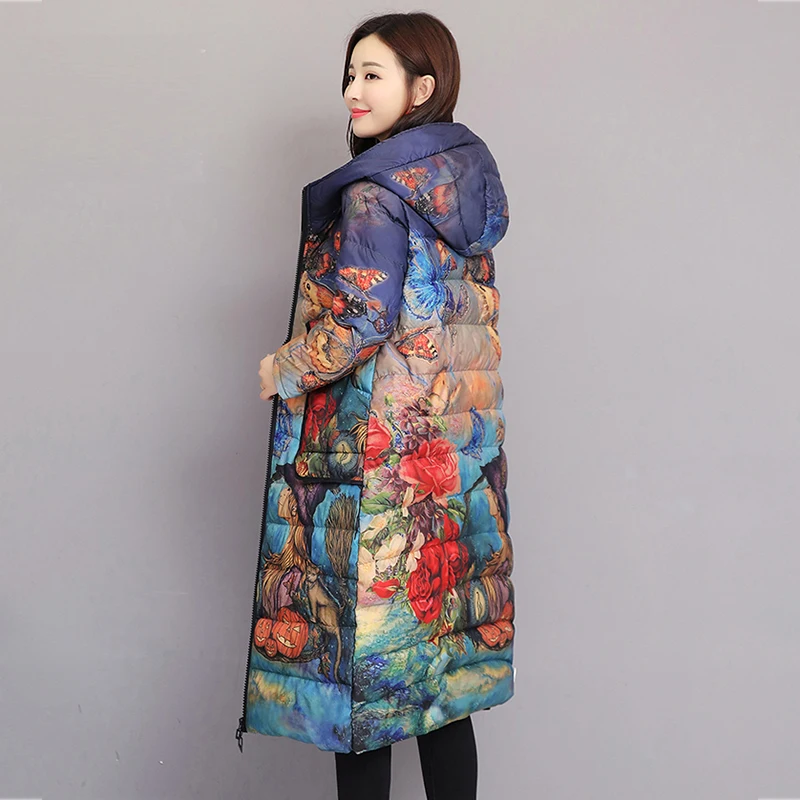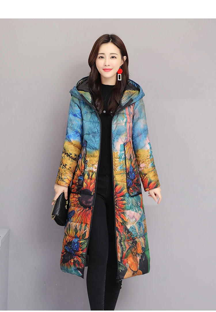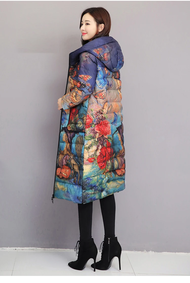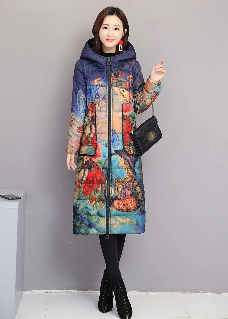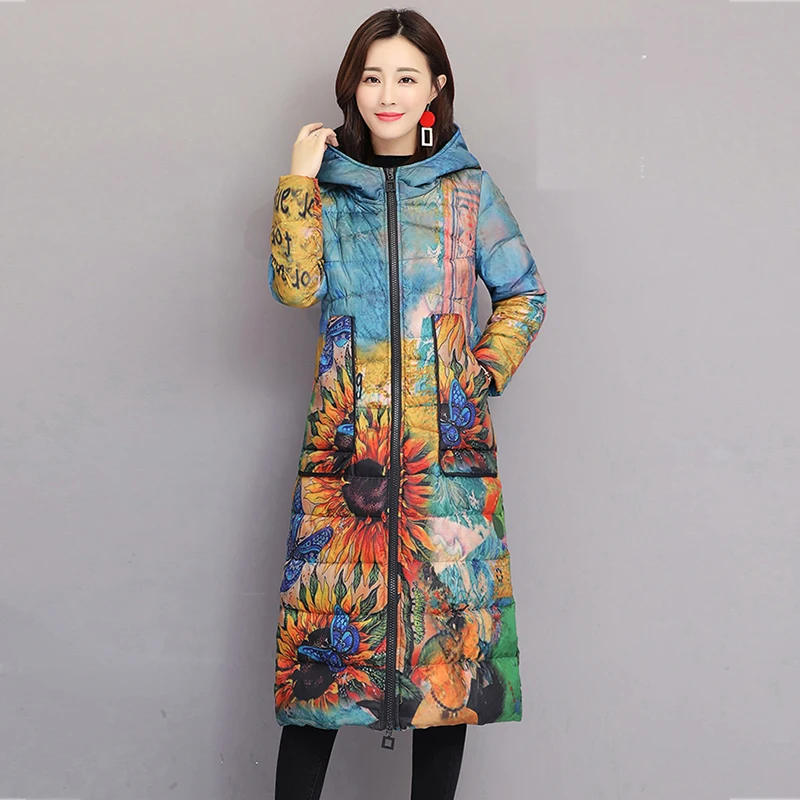 Женский пуховик, зимнее пальто с цветочным рисунком, длинная парка ...