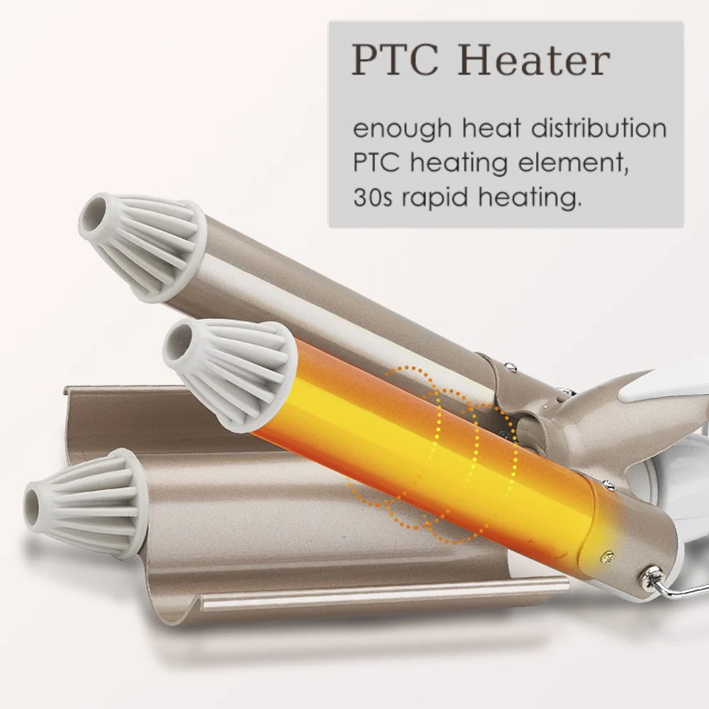 [Ptc нагреватель]: PTC нагреватель с быстрым нагревом, обеспечивает непревзойденное распределение тепла. Эта плойка с тройным цилиндром увеличивается в пределах 0 до 410 ℉(210 ℃) всего за одну минуту, что позволяет легко регулировать температуру в соответствии с вашим типом волос и сократить время переодевания.