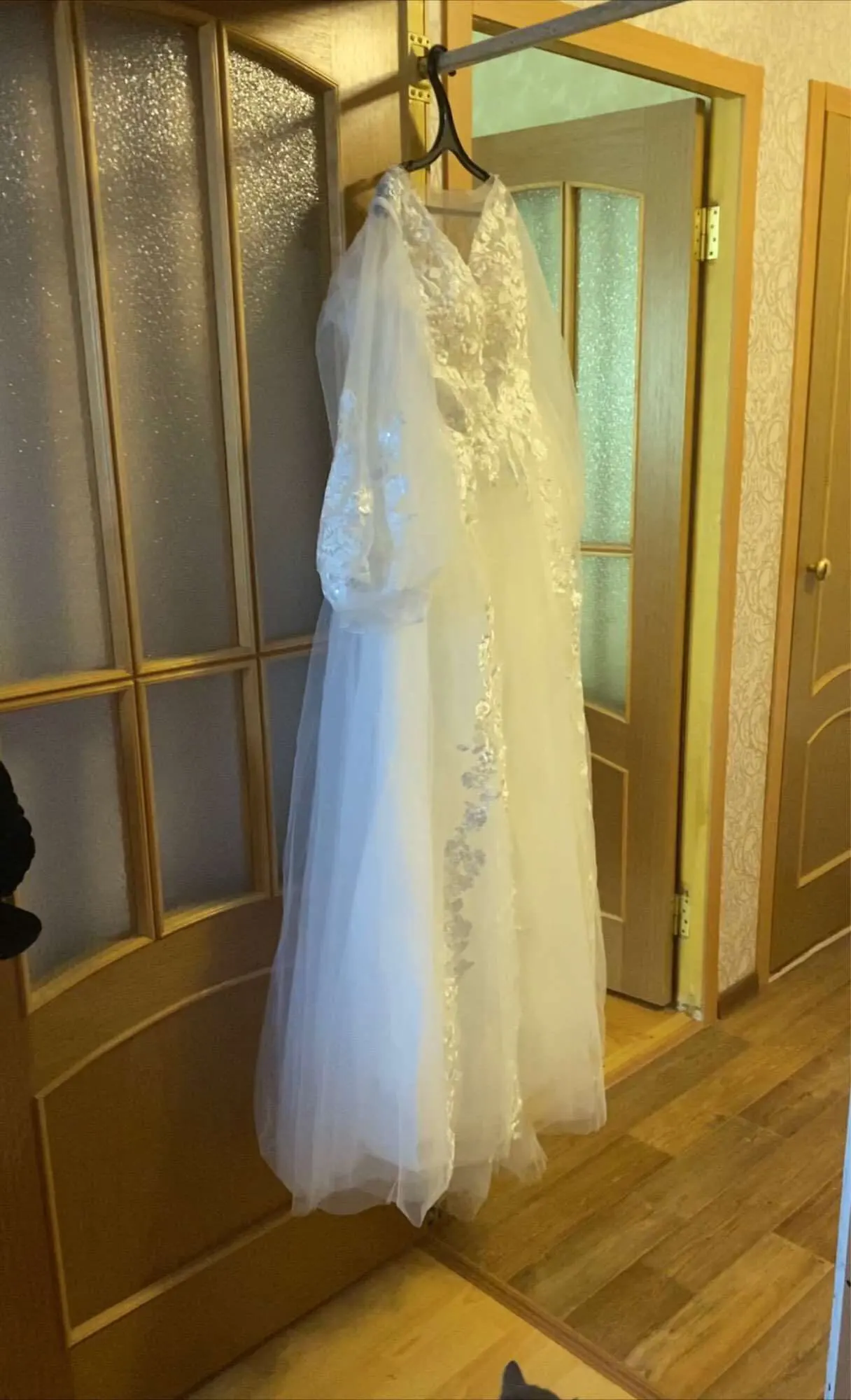Платье Свадебное ТРАПЕЦИЕВИДНОЕ с пышными длинными рукавами и V-образным вырезом