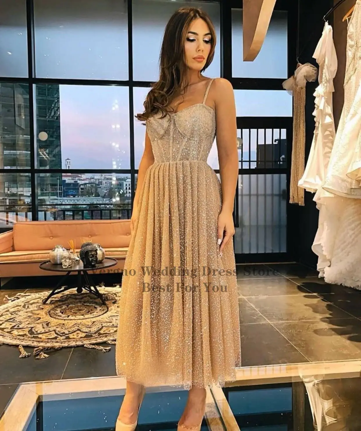 Блестящие трапециевидные Короткие вечерние платья цвета шампанского Verngo с топом с косточками блестящие вечерние платья длиной ниже колена на тонких бретелях