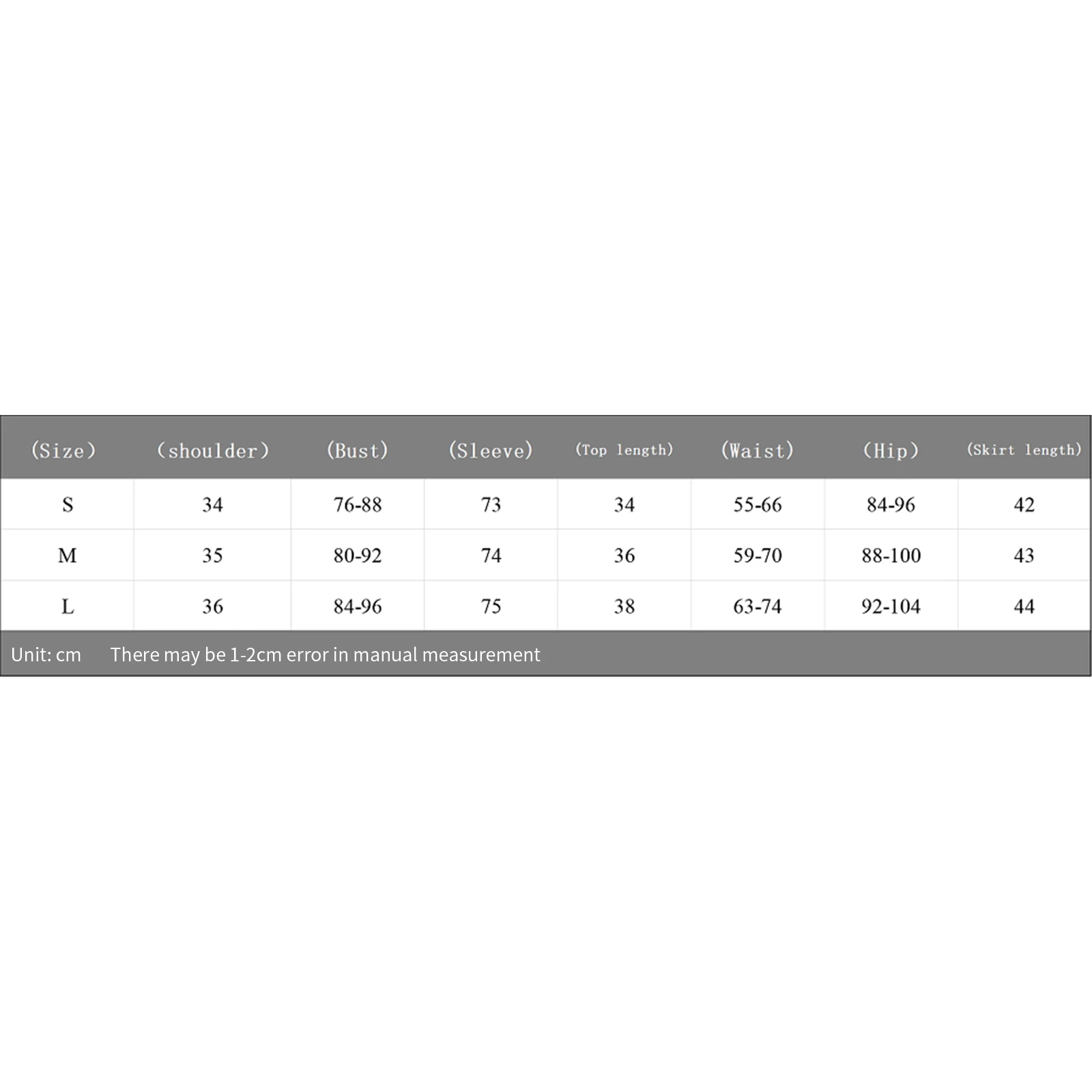 L Длина верха: 14,96 Бюст: 33,07-37,8 Рукав: 29,53 Плечо: 14,17 Длина юбки: 17,32 Талия: 24,8-29,13 Бедра: 36,22-40,94