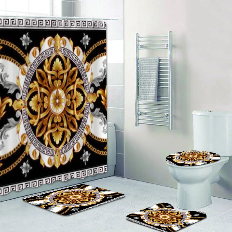 Роскошная Черная золотая барокко занавеска для душа, Современная Золотая Дамасская длинная занавеска для ванной комнаты s, коврики для ванной, домашний декор