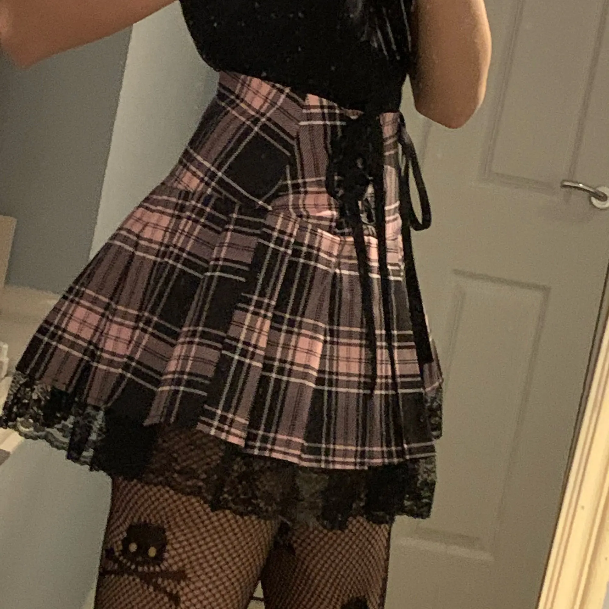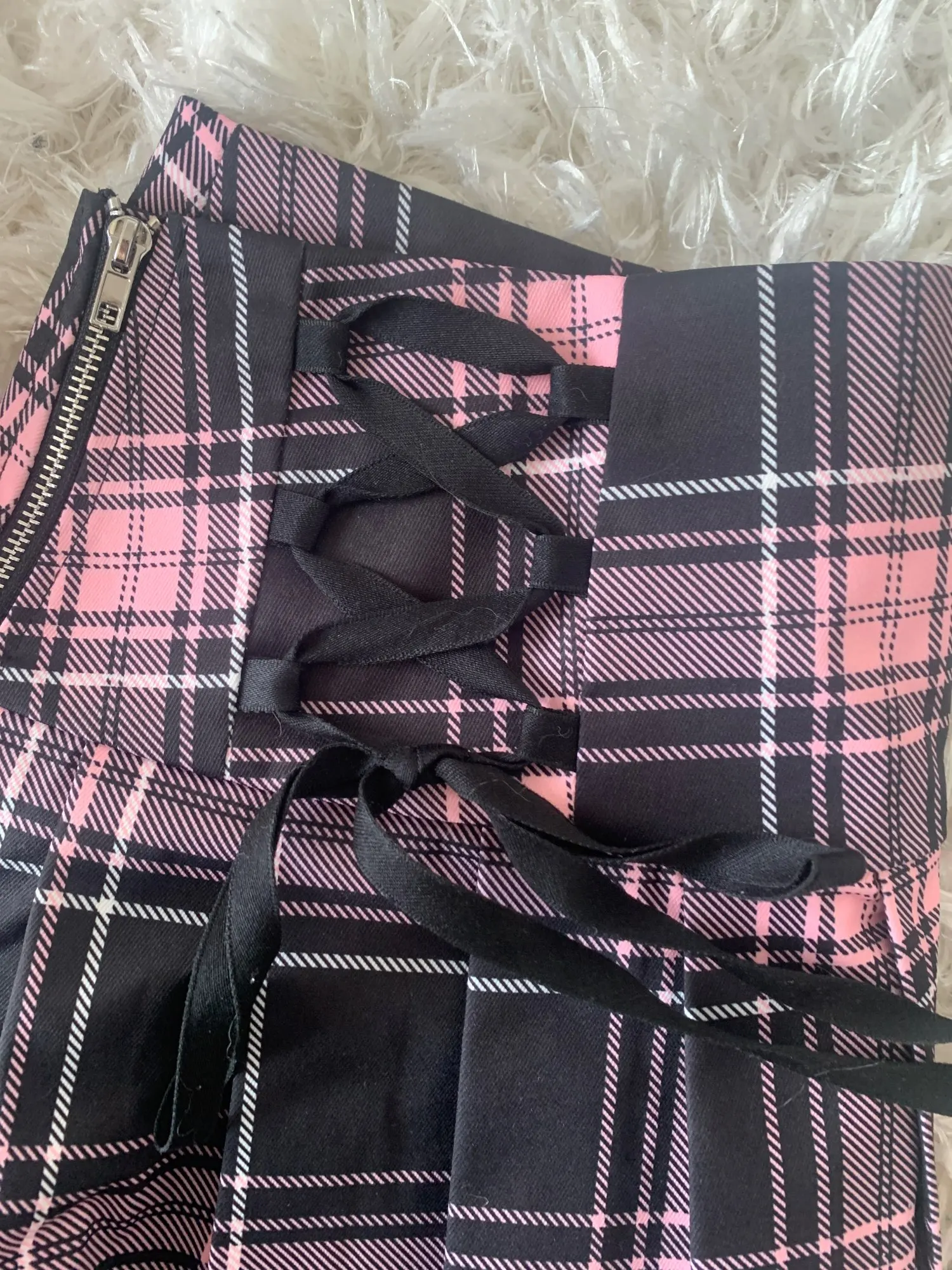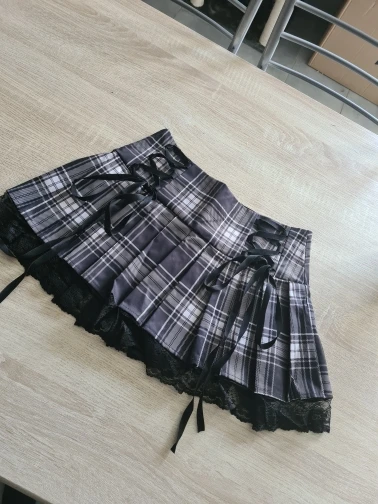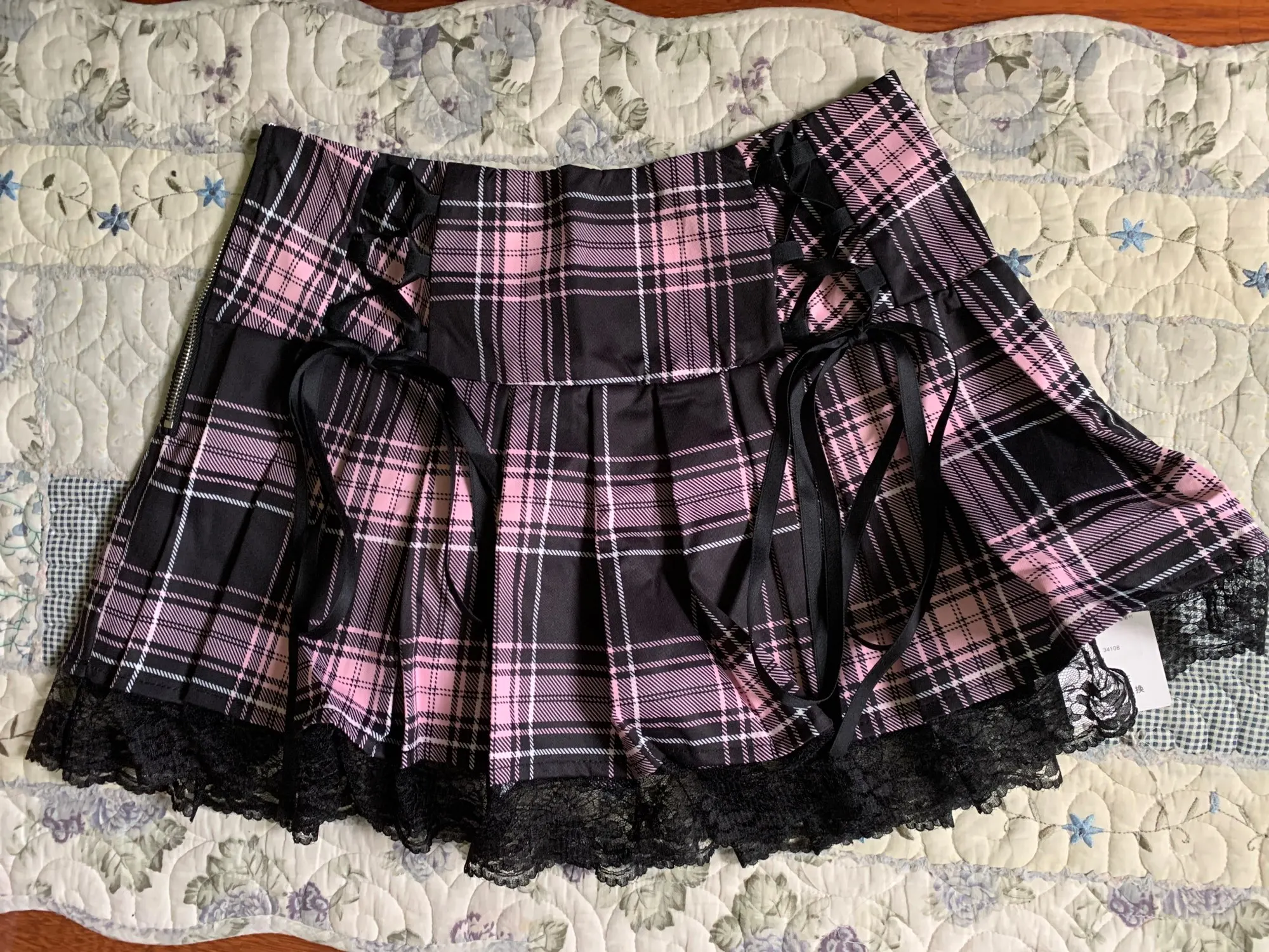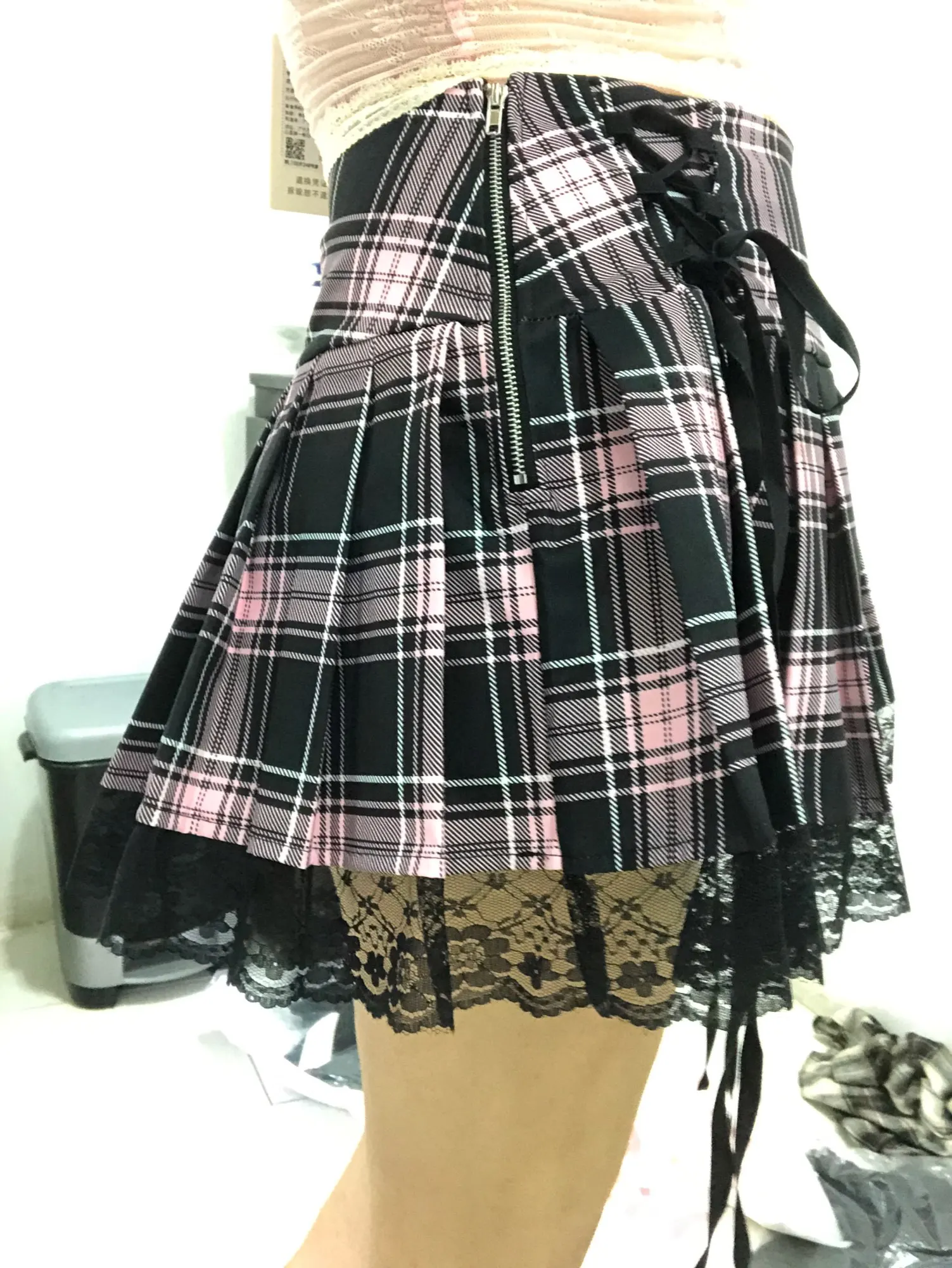 Юбка женская плиссированная розовая в клетку, с кружевной отделкой