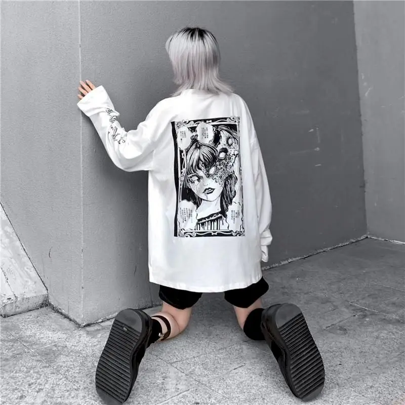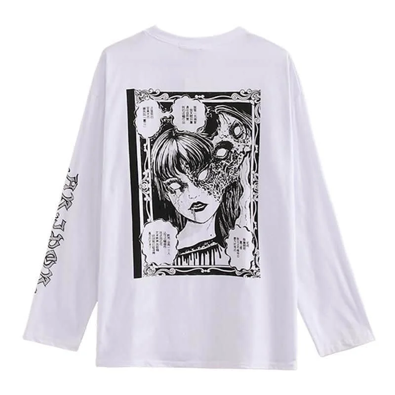 2021 Женская белая футболка с длинным рукавом Ранняя осень корейский аниме стиль Харадзюку похоронный Темный принт Свободный Повседневный Топ