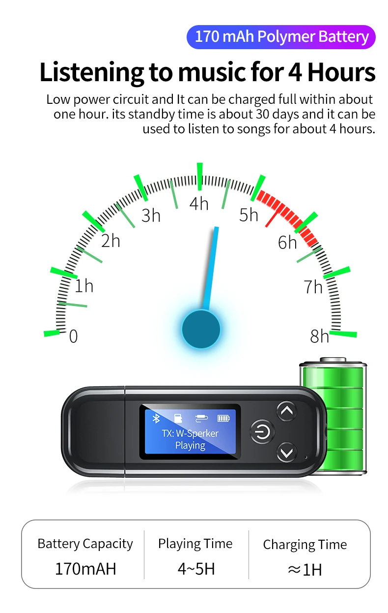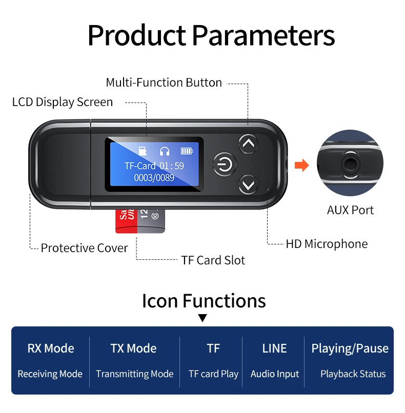 Версия Bluetooth: Bluetooth V5.0 Поддерживающие протоколы: V5.0 EDR,A2DP,HSP,AVRCP Расстояние Bluetooth: 10 м (пустое место) Подключение режима TX: 3,5 мм стерео интерфейс/USB стерео интерфейс Подключение режима RX: 3,5 мм стерео интерфейс Режим RX с микрофоном: Поддержка звонков Handfrees Время прослушивания музыки: около четырех часов Совместимость: Android, IOS системный телефон и планшет, и все Bluetooth аудио устройства, аудио устройства с аудиовход Основные функции: прием/передача Bluetooth, воспроизведение карт TF, воспроизведение голоса навигатора, ключевые операции, ЖК-цифровой дисплей