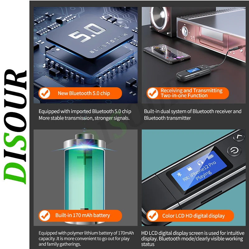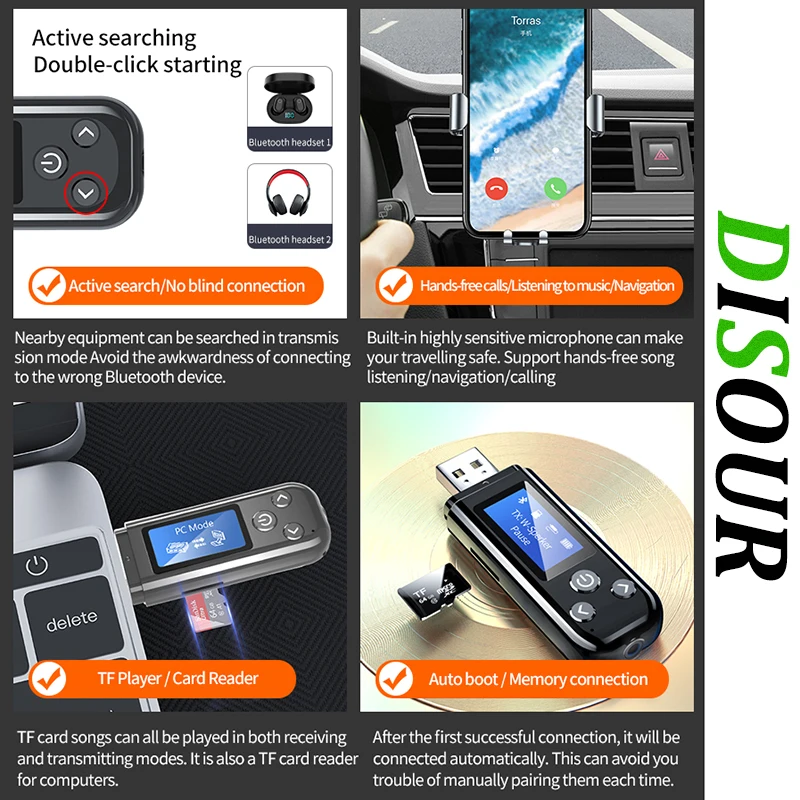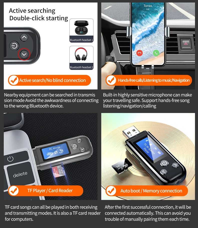 ① Оснащен чипом Bluetooth 5,0, стабильной передачей без задержек и качеством звука без потерь; ②Bluetooth прием и передача двух в одном, без драйвера, подключи и работай; ③ ЖК-дисплей высокой четкости, режим Bluetooth и рабочий статус четко видны; ④Режим запуска может отображать имя сопряжения, активно искать и отказываться подключаться слепо (эта функция является первой); ⑤ Встроенный полимерный аккумулятор 170мА, непрерывное прослушивание песен около 4 ч, Прямая зарядка/источник питания от USB; Support поддержка воспроизведения tf-карт, а также считыватель карт и внешняя звуковая карта компьютера; Built Встроенный микрофон высокой четкости, поддержка громкой связи/прослушивания музыки/навигации; ⑧Функция памяти, автоматическое повторное подключение после первого сопряжения; Stable стабильная передача сигналов без препятствий около 10 метров;