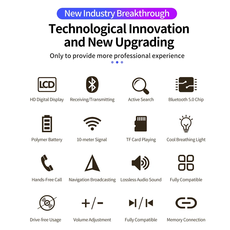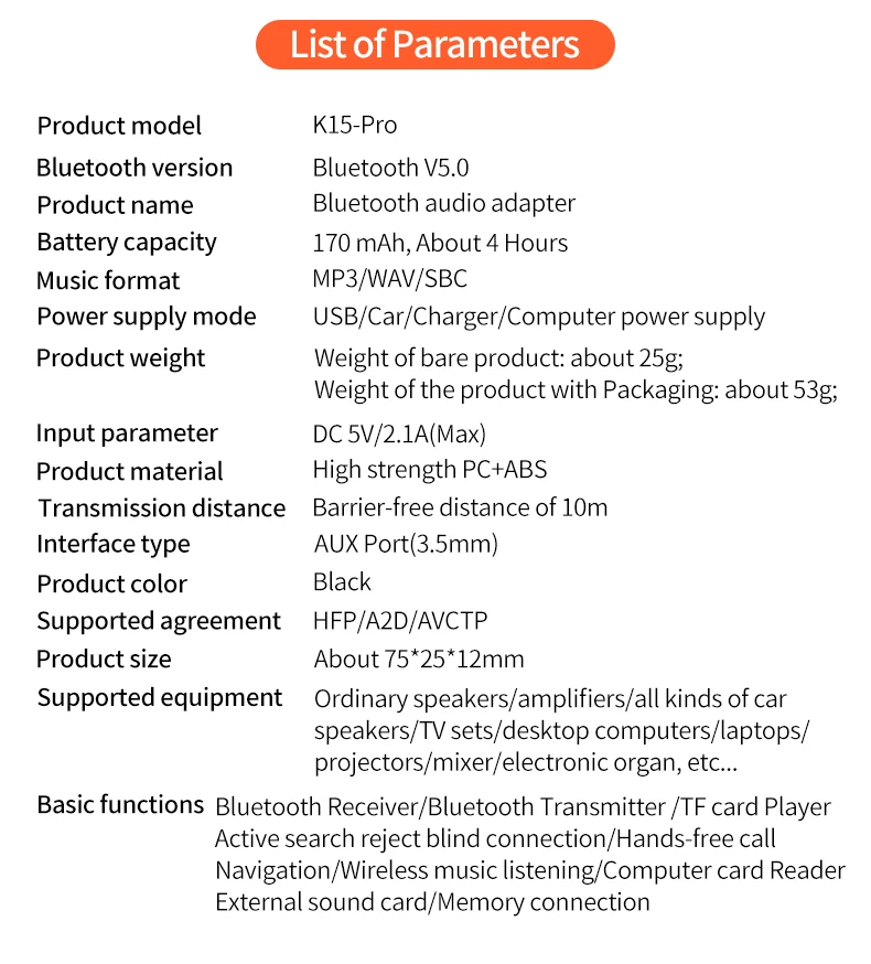 Версия Bluetooth: Bluetooth V5.0 Поддерживающие протоколы: V5.0 EDR,A2DP,HSP,AVRCP Расстояние Bluetooth: 10 м (пустое место) ТХ моde подключение: 3,5 мм стерео интерфейс/USB стерео интерфейс RX режим подключения: 3,5 мм стерео интерфейс Режим RX с микрофоном: поддержка вызова Handfrees Время воспроизведения музыки: около четырех часов Совместимость: Android, IOS system phone и PAD, и все аудио устройства Bluetooth, аудио устройства с аудио входом Основные функции: прием/передача Bluetooth, воспроизведение tf-карт, голосовое воспроизведение навигатора, ключевые операции, цифровой ЖК-дисплей