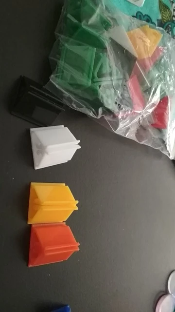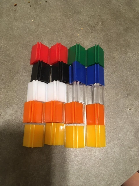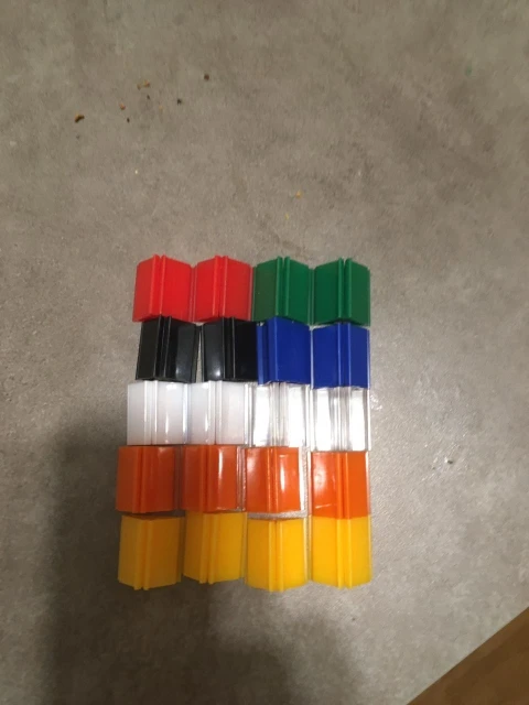 Я получил: -4 оранжевых -4 кристалла -2 черных -2 желтые -2 красных -2 зеленых -2 белых -2 темно-синего цвета По крайней мере, один прозрачный синий был бы хорошим. Цвета немного темнее, чем на фотографиях. Не подходит для тонкой бумаги, но я хочу их для карт с рукавами, так что... Они идеальные.