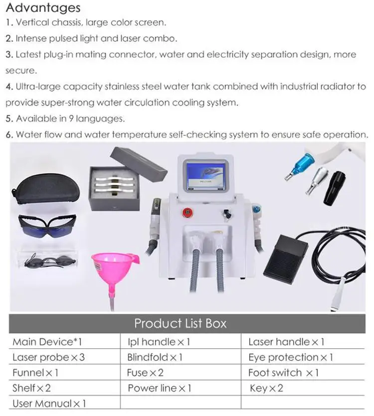 Многофункциональный портативныйIPL + Nd yagЛазерная машина является многофункциональным инструментом красоты, который интегрирует Мощный импульсный светильник, лазерную и радиочастотную технологию, которая является ядром области красоты технологий. Он сочетает в себе различные энергии, полностью воздействует на светильник, энергию и электрическую энергию и оказывает значительное клиническое воздействие; Было доказано, что он безопасен и эффективен для кожи с различными типами кожи и оттенком кожи.