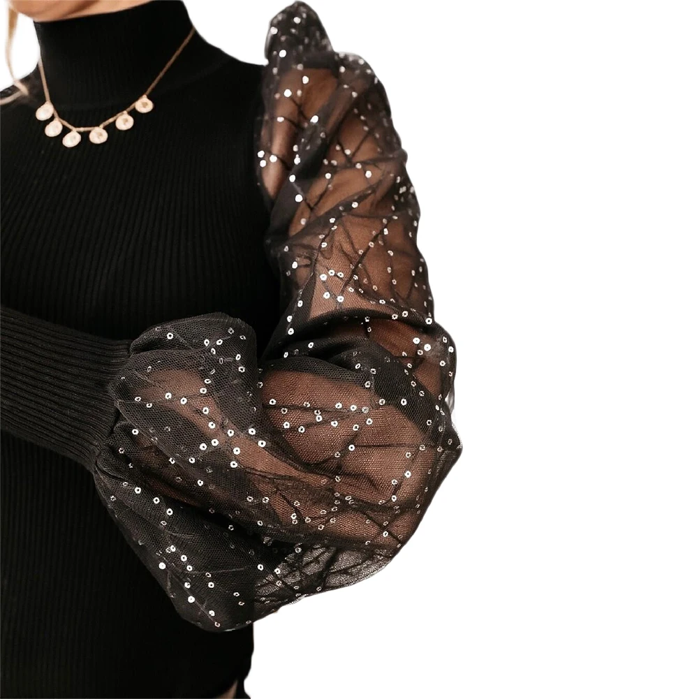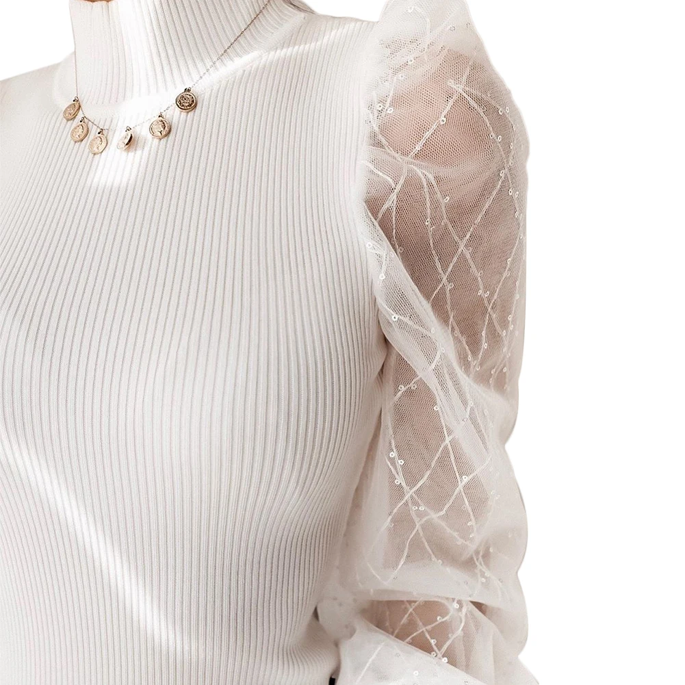 Женская Сексуальная Блузка прозрачные рукава-фонарики с оборкой вышитые блузки одноцветное с ребристая трикотажная одежда; Сезон весна-осень рубашка S-XL