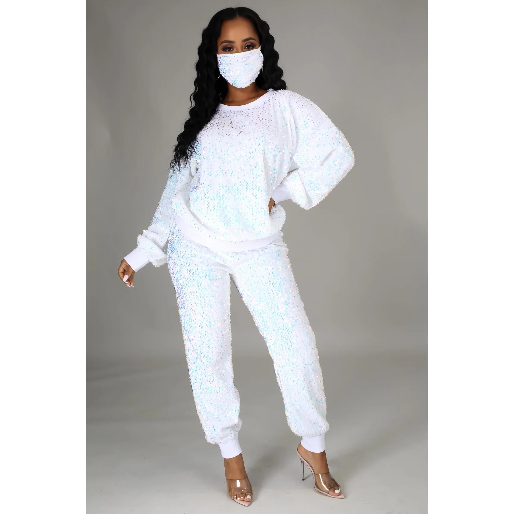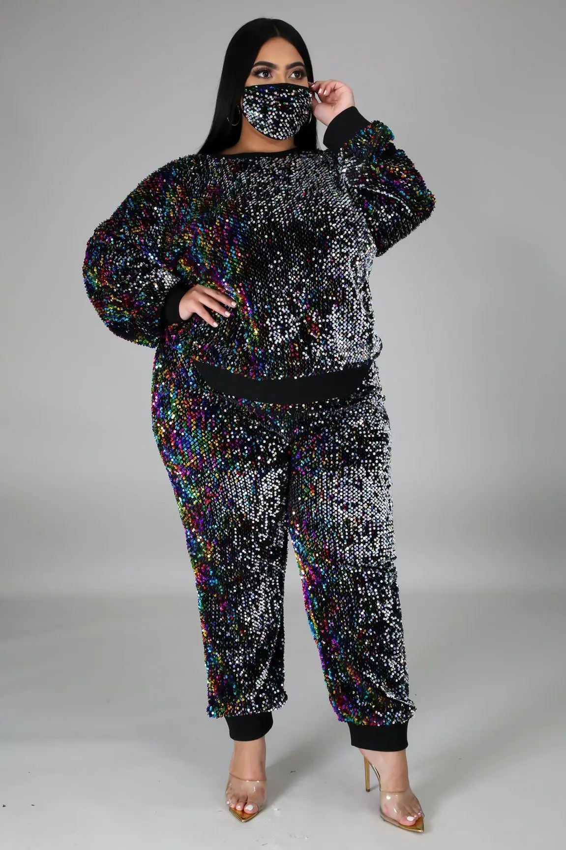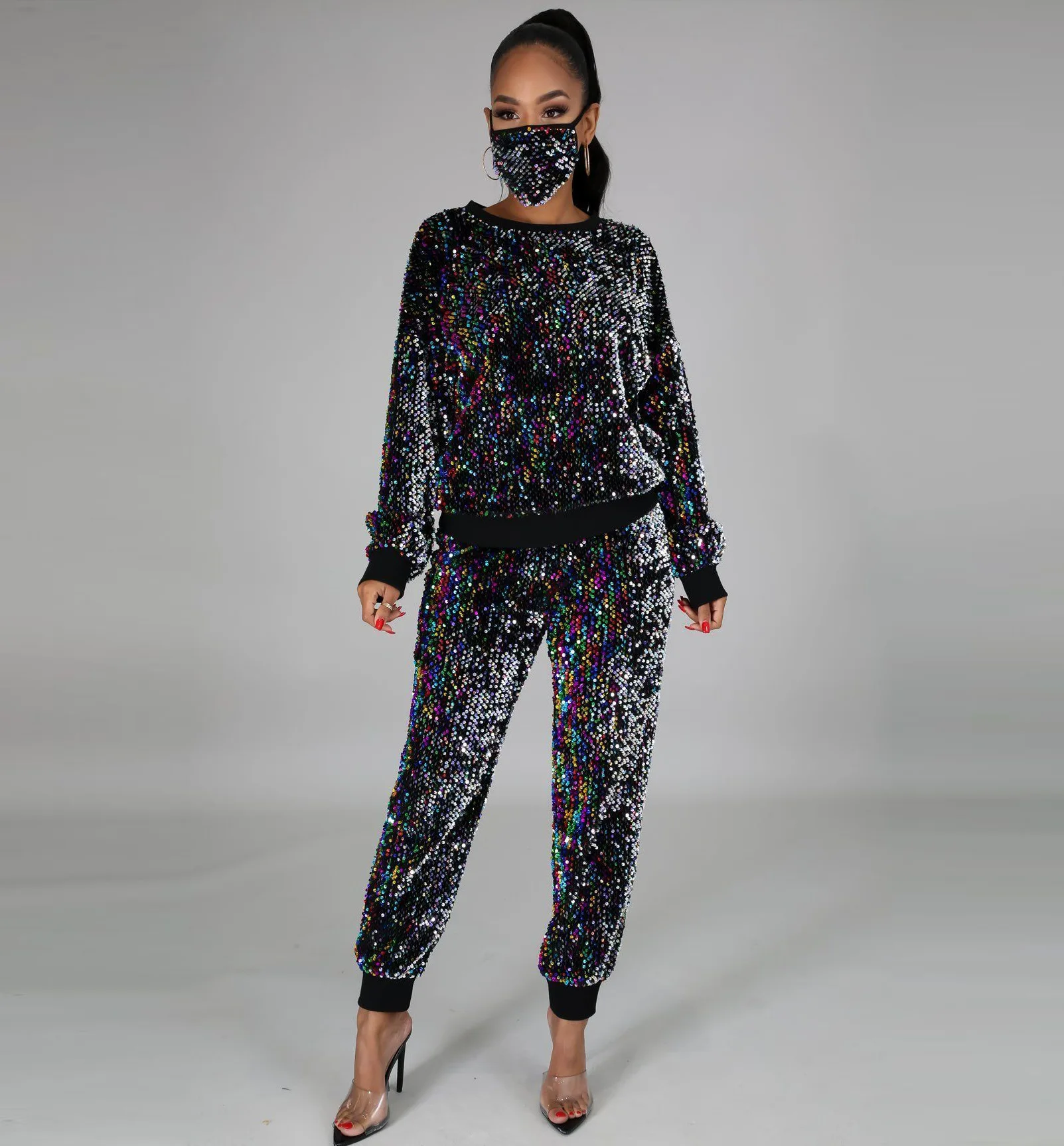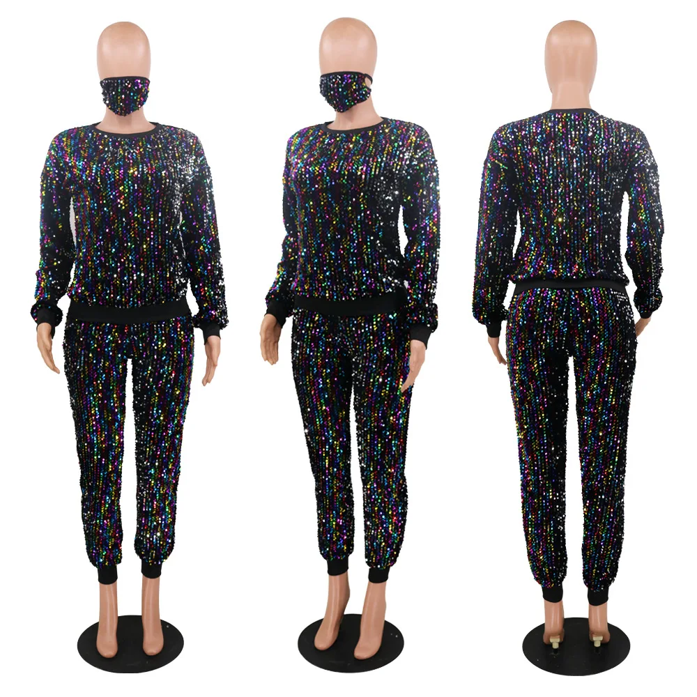 Комплект из двух предметов, женская одежда, модная вечерняя одежда с блестками и блестками, пуловер с длинным рукавом и брюки, подходящий костюм с маской