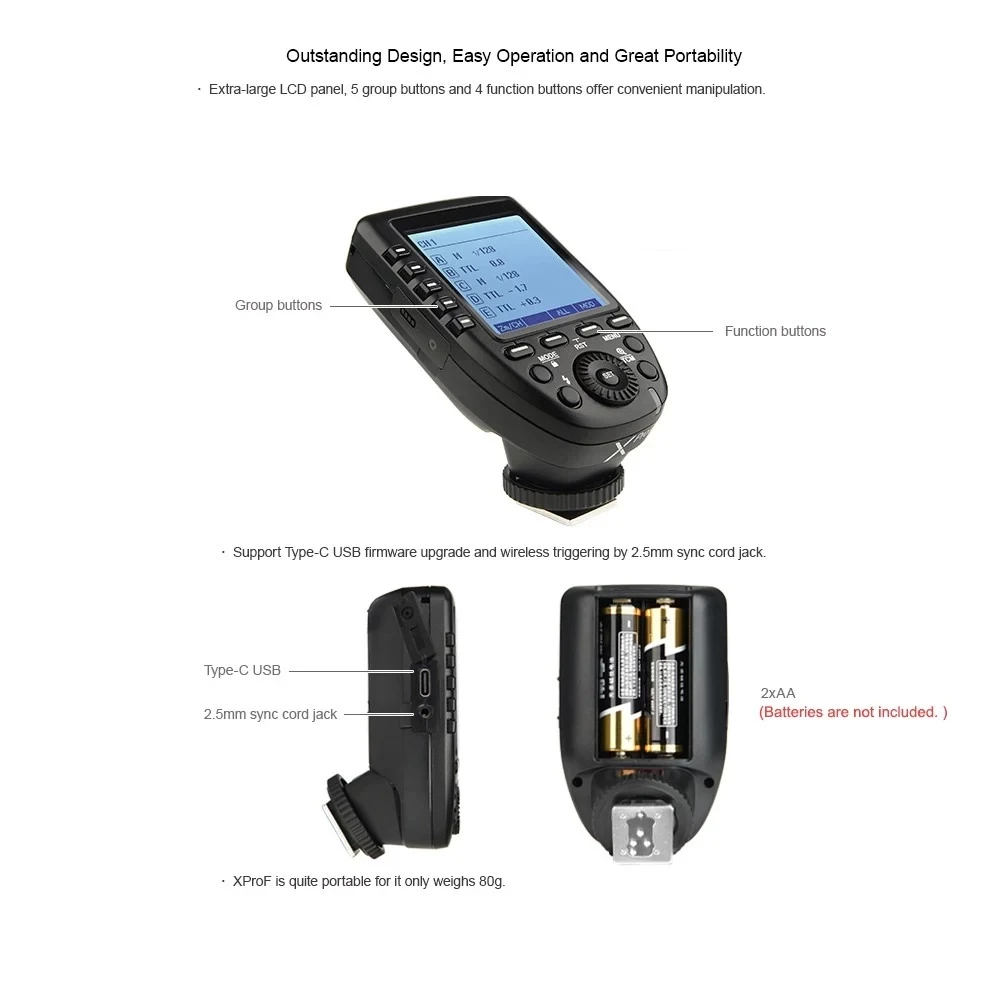 Встроенная беспроводная система Godox 2,4G X и универсальные методы использования. 16 групп и 32 канала для беспроводного управления и запуска. Добавьте настройки беспроводного идентификатора 01-99, что может достигать срабатывания только тогда, когда каналы и беспроводные идентификаторы главного и подчиненного блока настроены таким же образом, эффективно избегая помех сигнала. Полная поддержка TTL автовспышка, 1/8000s высокоскоростную синхронизацию, мульти вспышка, ручная вспышка вспышки Компенсация экспозиции, TCM функции преобразования, функция увеличения, одна съемка и мульти-стрелять, управление лампами группового моделирования, масштабирование групп, одновременная Регулировка выходного значения всех групп и т. д. Экстра-большая ЖК-панель, 5 групповых кнопок и 4 функциональных кнопки обеспечивают удобную манипуляцию. Только вес 80 г для большой портативности. Поддерживающий Тип-C USB обновление прошивки и беспроводной Запуск по 2,5 мм кабель синхронизации. Вспышка триггер совместим для ЖК-дисплея с подсветкой Fujifilm серии камера в том числе GFX50S, X-Pro2, X-T20, X-T2, X-T1, X-Pro1, X-T10, X-E1, X-A3, X100F, X100T & для камеры с синхронизацией с компьютером.