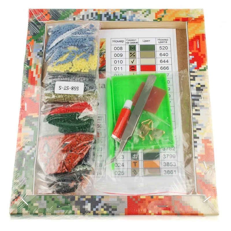 Базовый материал – холст, на котором напечатана цветная схема с контрастными условными обозначениями. Поверх него нанесено клеевое покрытие и защищающая прозрачная плёнка. Затем, используя комплект акриловых камней, вы постепенно заполните ряды и соберёте прекрасное детализированное изображение в формате 20*25 см.