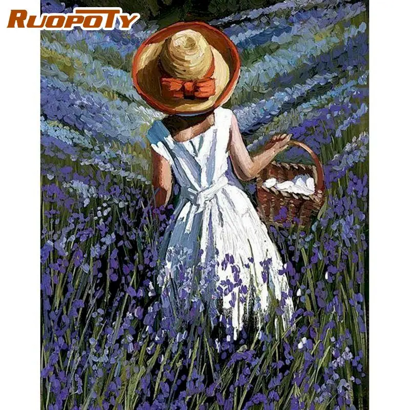 RUOPOTY картина маслом по номерам с рамкой, маленькая девочка в траве, пейзаж, картина по номерам, ручная роспись, домашнее украшение для стен, искусство