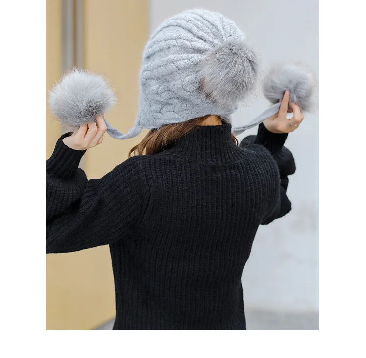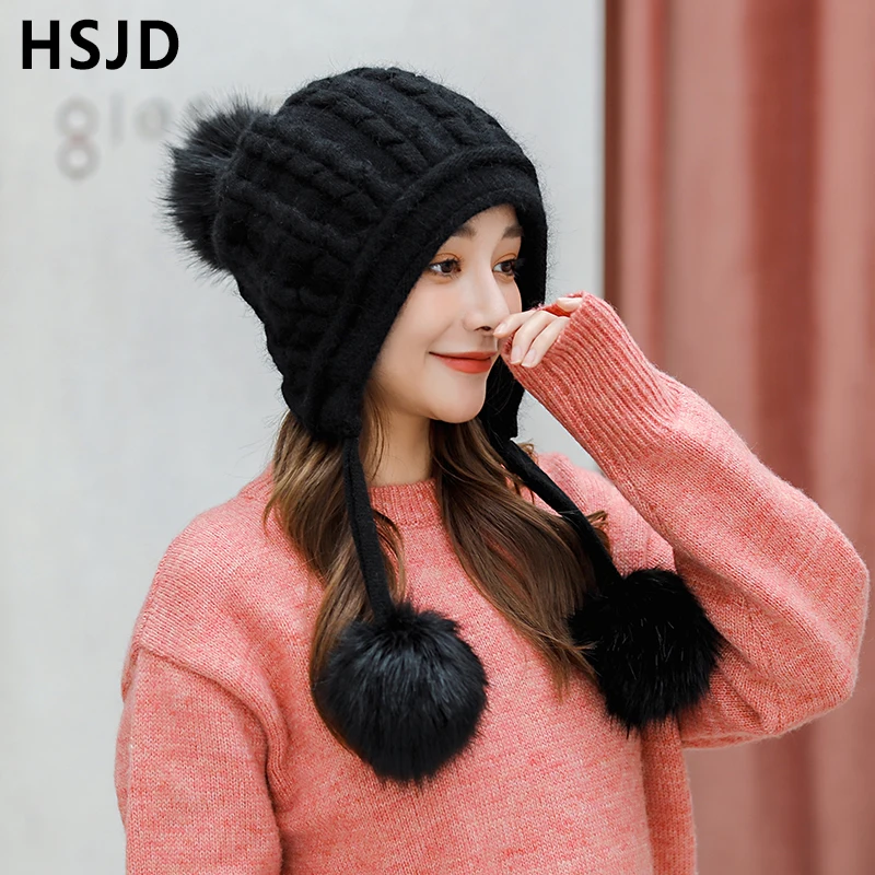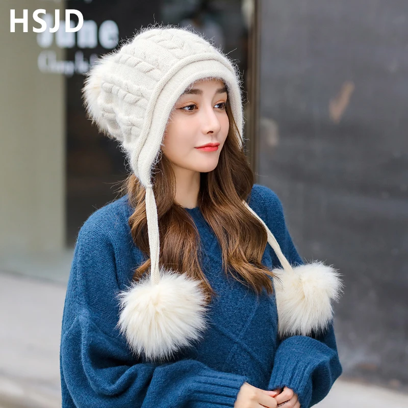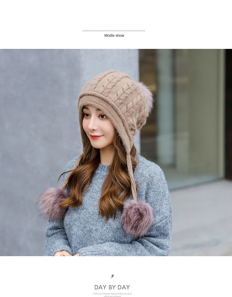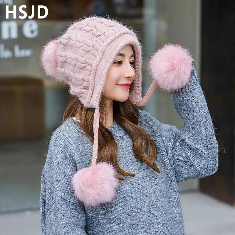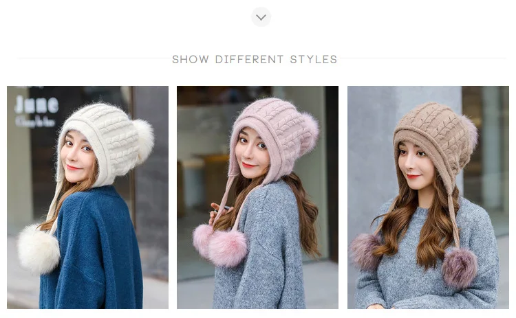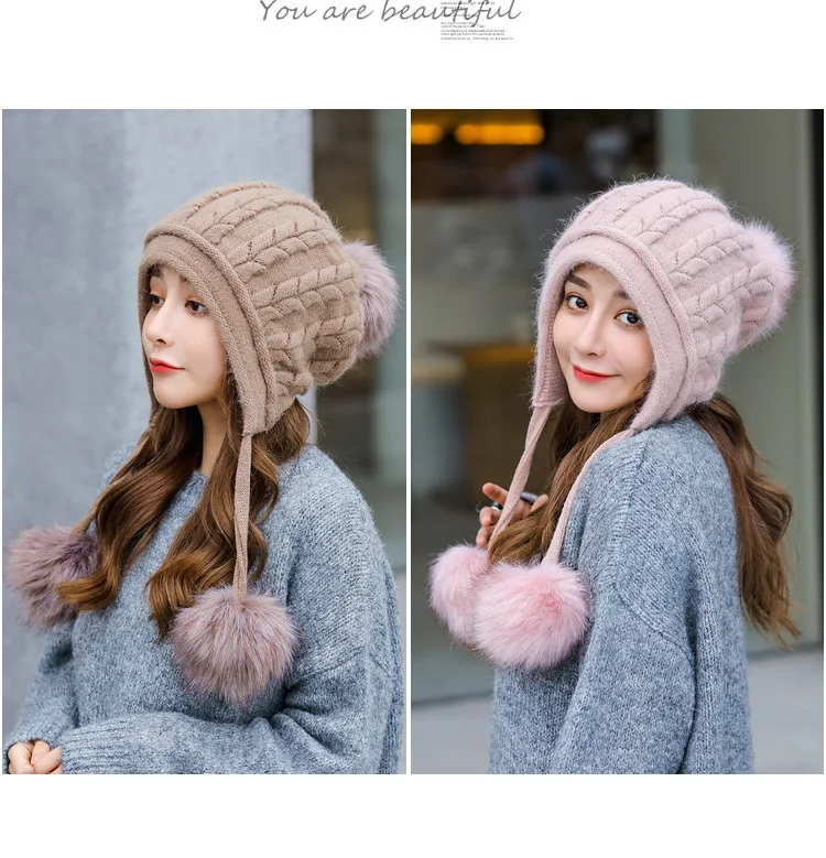 Женские зимние шапки с 3 меховыми помпонами, вязаные шапки с цветами, шапки ручной работы, вязаные крючком, теплые шапки, чепчик для девочки