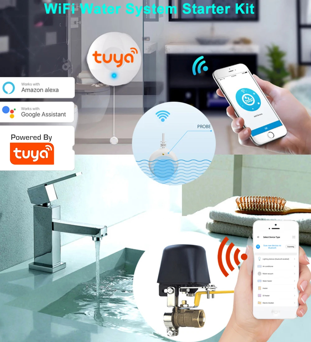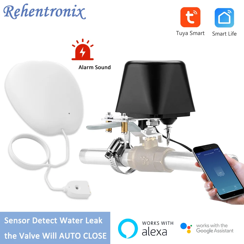 Умный датчик утечки воды с клапаном, датчик с функцией Alexa и Google Voice, работает от Tuya