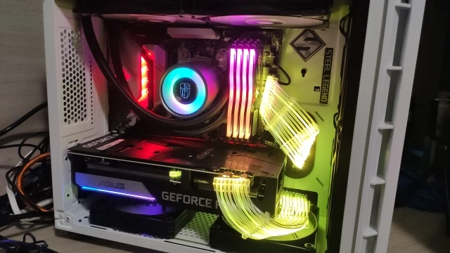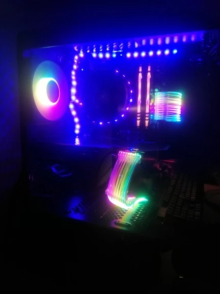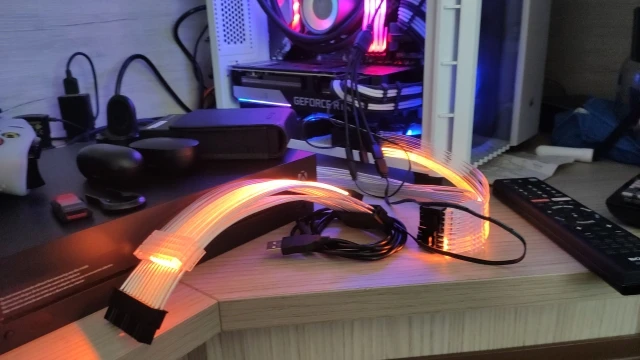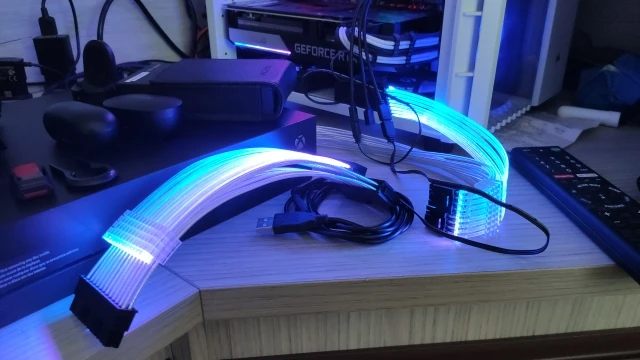Заказ пришёл за 2.5 недели (МСК), упаковано было в картонную коробку, которая, кстати, даже не помялась в пути. Трек отслеживался. А теперь о самом товаре: существует (у данного продавца) две версии. Первая с коннектором 4пин (12v. RGB) и у неё идёт подсветка только по краям проводов питания. У второй версии коннектор 3пин (5v. ARGB) и подсветка идёт поверх проводов питания. Поясняю это для тех, кто не умеет читать описание товара, а потом в комментариях жалуется, что подсветка только по краям или разъём к мат плате не подошёл. Я заказывал 4пин (12v. RGB), ибо мне нужно было выгибать его в другую сторону, потому что карта стоит вертикально. Расстроило только, что при выставлении белого цвета подсветки - цвет уходит в сторону фиолетового и белого свечения добиться не получается, но если выставлять более яркие цвета (зелёный, красный, синий и т.д.), то светится отлично.