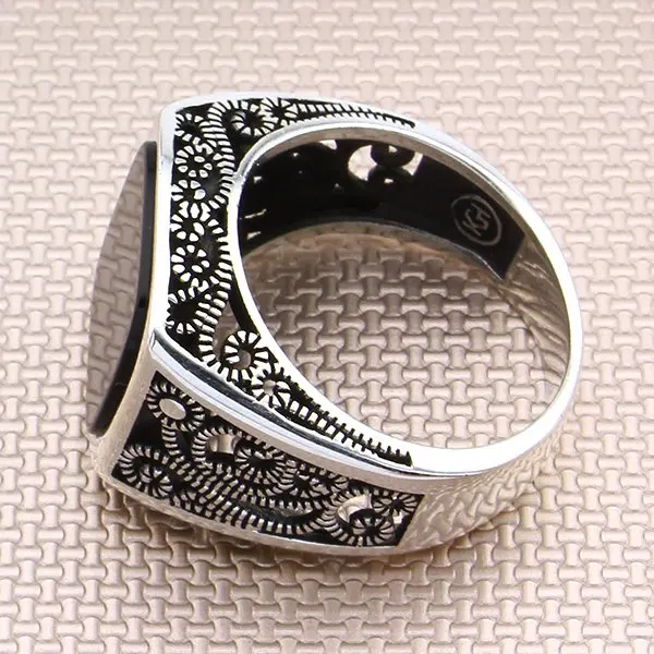 Мужское серебряное кольцо с квадратным черным ониксом, симметричный мотив, Сделано в Турции