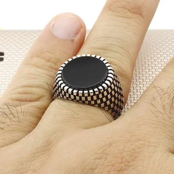 Мужское серебряное кольцо с Круглым Черным Ониксом, симметричный мотив, Сделано в Турции