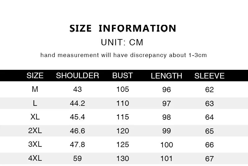 1. Каждый размер продукта будет отличаться. Пожалуйста, ознакомьтесь с таблицей размеров при покупке или рекомендуемым ростом и весом. Если вы не знаете, как выбрать размер. Пожалуйста, сообщите мне ваш рост _ см и вес _ кг.2. Таблица размеров относится к размеру одежды. Не измерения вашего тела.3. Если ваши измерения между двумя размерами, пожалуйста, выберите следующий больший.4. Замеры сделаны вручную, поэтому возможны отклонения на 1-3 см.