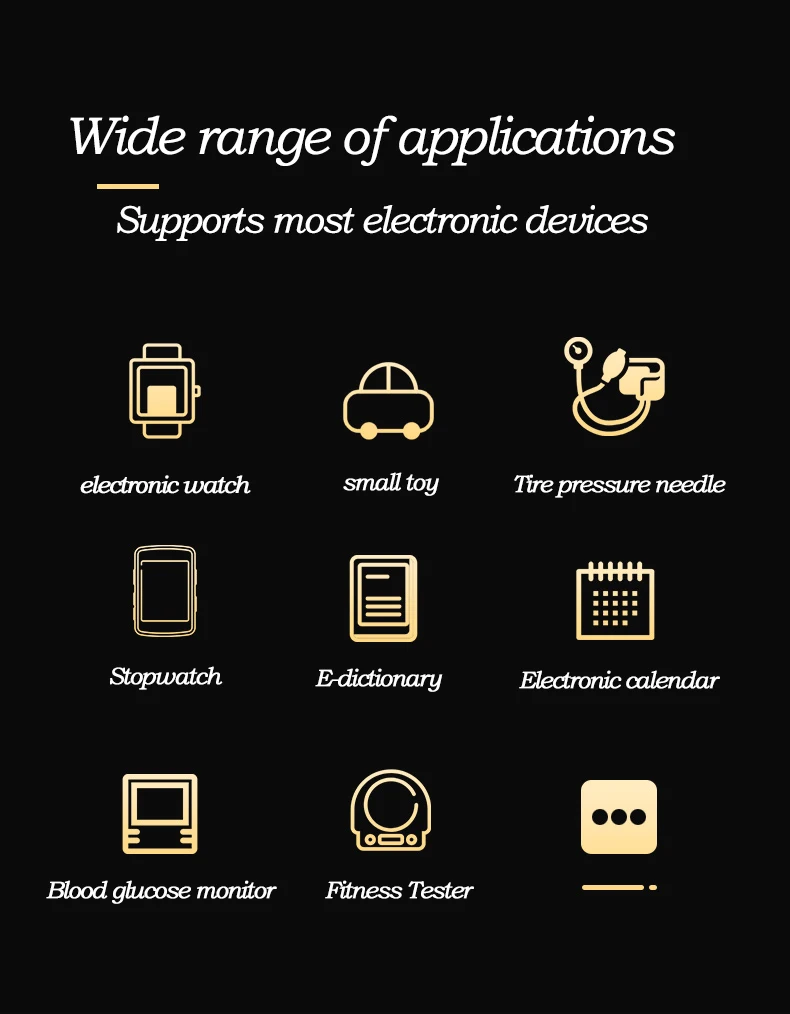Применение:Часы, камеры, калькуляторы, Автомобильная охранная сигнализация, автомобильные пульты без ключа, органайзеры, глюкометры, компьютерное оборудование (запасная батарея памяти), игрушки, акутрон, коммуникационное оборудование, пакет данных для видеокамер и т. Д.