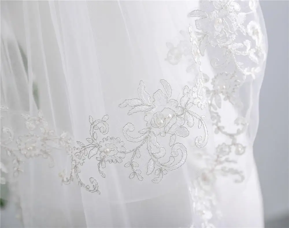 Фата свадебная короткая с гребнем JaneVini, белая романтичная кружевная, с аппликацией по краю, с жемчугом, свадебная фата платье невесты, 2021
