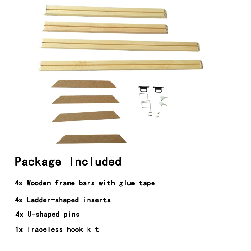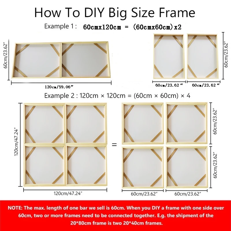 Убедитесь, что ваша картина с дополнительным краем 3 см, я имею в виду, что размер холста должен превышать размер деревянной рамки не менее 6 смПримечание: Это только деревянная рамка без рисунка