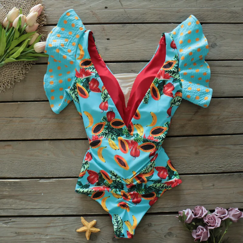 Женский кружевной слитный купальник, купальник с V-образным вырезом и оборками, пляжная одежда, монокини с принтом, 2021