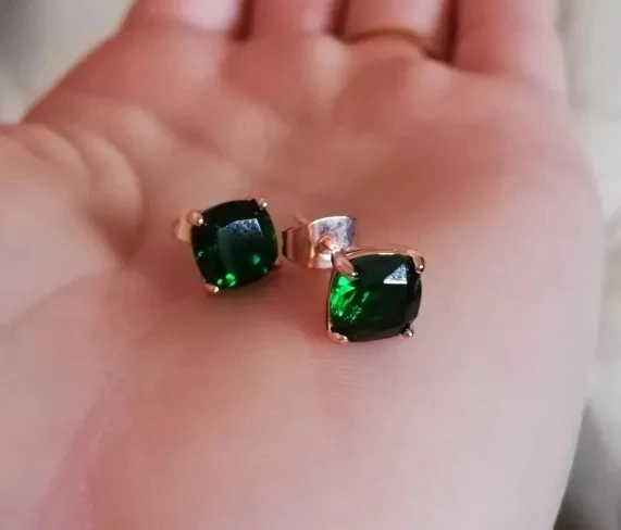 Серьги-гвоздики Женские квадратные под розовое золото с зеленым камнем