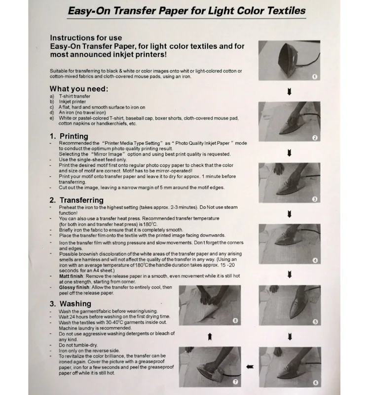 Струйная Печать термопереводная бумага, подходит для любого материала хлопка или хлопчатобумажной ткани Инструкции по переносу узоров на черный или светильник из цветной ткани: Вам нужно: 1. Футболка термопечать темная бумага, изоляционная бумага 2. Струйные принтеры 3. Железо (Не используйте функцию пара) или термопресс 4. Черный или светильник-цветные футболки, шаровые шапки, шорты, тканевые коврики для мыши, носовые платки и другие хлопковые ткани. Принт: 1. Рекомендуется установить для принтера режим "качество фото струйная бумага" для печати качества фото. 2. После выбора цвета и размера рисунка, пожалуйста, выберите правильный режим печати (не нужно устанавливать зеркальную печать), Печать рисунка на правильной стороне использования (печатная сторона) термопереводной бумаги. Наша переводная бумага не требует никаких чернил, Можно использовать любой бренд обычных красящих чернил, пигментных чернил и т. д. 3. Дайте напечатанной бумаге высохнуть, Вырежьте изображение, которое вам нужно, оставив по крайней мере 5 мм вокруг края узора, Затем Снимите пленку непосредственно с базовой бумаги. Передача горячего тиснения: 1. Разгладьте ткань, чтобы быть горячей штамповкой, Снимите пленку для переноса с печатной бумаги и поместите ее на место, где требуется горячее тиснение. 2. Пожалуйста, установите температуру передачи до 180 °C, а время горячего тиснения машины передачи тепла до 25 секунд. 3. Накройте пленку для переноса бумагой и установите одежду вместе и поместите ее под давлением. 4. Если вы используете железо, пожалуйста, предварительно нагревайте до заданной температуры (около 2-3 минут), не используйте функцию пара! Изоляционная бумага для теплопередачи 5. При горячей штамповке действие происходит медленно и вниз, и каждый угол и край должны быть горячими. 6. Уход за бумагой: после глажки его можно полностью остыть, а затем отделить низкую бумагу от угла. 7. Может быть горячая порвана (т. Е. Выделенная бумага оторвана без охлаждения). Стирка: 1. Пожалуйста, держите его сухим после горячего тиснения в течение 24 часов перед первой стиркой. 2. Переверните ткань (Не используйте моющее средство или отбеливатель) 3. Положите его в стиральную машину при 30-40 ℃ и постирайте.
